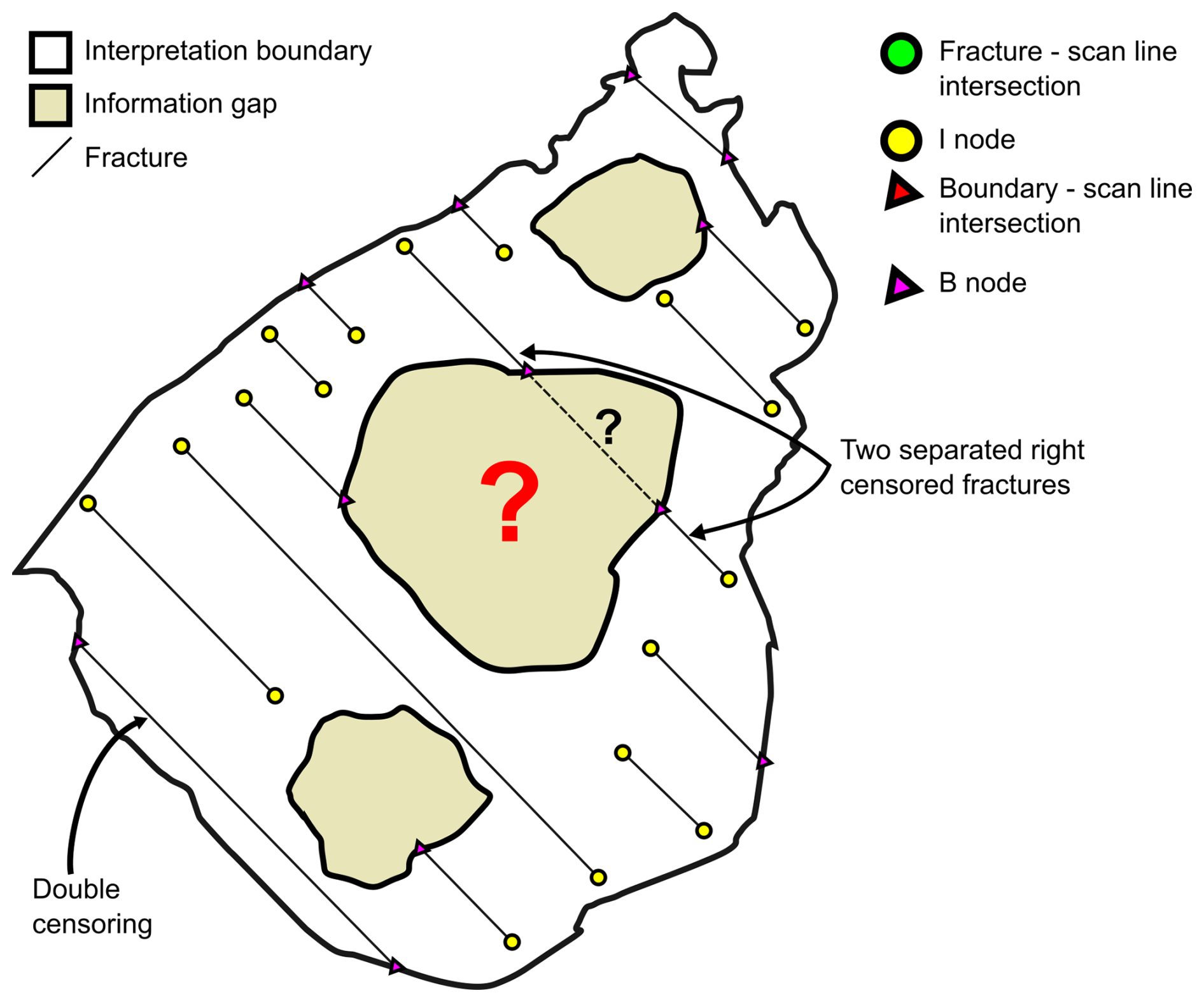 At the outcrop scale four major biases must be taken into account (Baecher and Lanney, 1978): orientation bias, truncation bias, censoring bias and size bias. The orientation bias stems from the nature of the intersections between the fracture plane and the outcrop surface and to the choice of the sampling dimensionality (e.g., lines, areas or volumes). It influences the representativity of field measurements, and results in downsampling of certain fracture sets with respect to others. The truncation bias imposes a lower boundary to the measured fracture trace length, and it is defined by the smallest feature that is possible to detect. The censoring bias is due to the finite nature of outcrops since the full length of the longest fractures is limited by the outcrop size, and in any case the length of fractures ending outside of the outcrop is not known exactly. The size bias states that larger fractures (i.e. fracture surfaces with a larger area) have a greater probability to intersect the outcrop surface and to be sampled. Another bias, related to layered media, is the under-sampling of fractures shorter than the bed thickness (Ortega and Marrett, 2000). This bias changes the shape of the length distribution, given that only the fracture high enough to abut or crosscut the bedding interface can be systematically sampled. To these major biases it is important to add that the morphological and weathering conditions of the outcrop strongly influence the calculation of parameters like topology, density and intensity. In addition to objective biases related to outcrop geometry or sampling methods, subjective biases introduced by the interpreter should also be considered (Andrews et al., 2019). In the specific context of automatic feature extraction, it is also important to account for biases inherent to the algorithms themselves, including the potential for extracting artifact features.