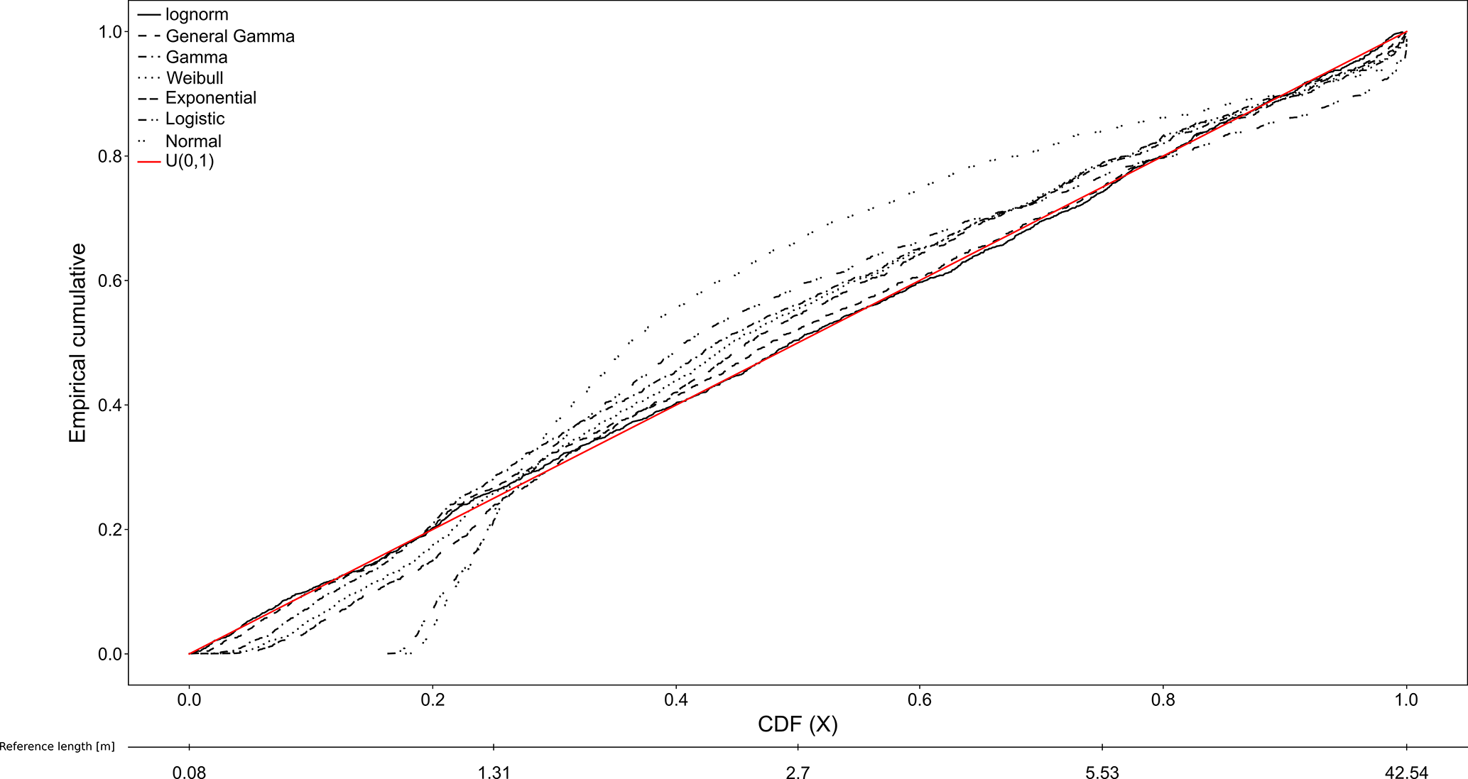 SE is tested with the Kolmogorov–Smirnov test (Stephens, 1974) against an exponential distribution to check the underlying colatitude distribution (exponentiality test). The Kuiper test (Stephens, 1974) is applied to test SU against a uniform distribution U(0,2π) to check the assumption of rotational symmetry around the mean vector (circularity test). The goodness-of-fit of SN to a normal distribution N(0, σ2) is tested with the Kolmogorov–Smirnov test (Stephens, 1974) to check against the correlation between colatitude and longitude (normality test) (Fig. 7).