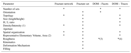 Table 1Summary of the fracture properties needed to quantitatively characterize a fracture network. (1) The Pxx system introduced by Dershowitz and Herda (1992) is generally used for density and intensity. (2) The representative elementary volume (REV) can be different for each property and the overall REV of the fracture network can be seen as a combination of REVs for individual properties (e.g. Martinelli et al., 2020). (3) Candela et al. (2012), (4) Bistacchi et al. (2011).