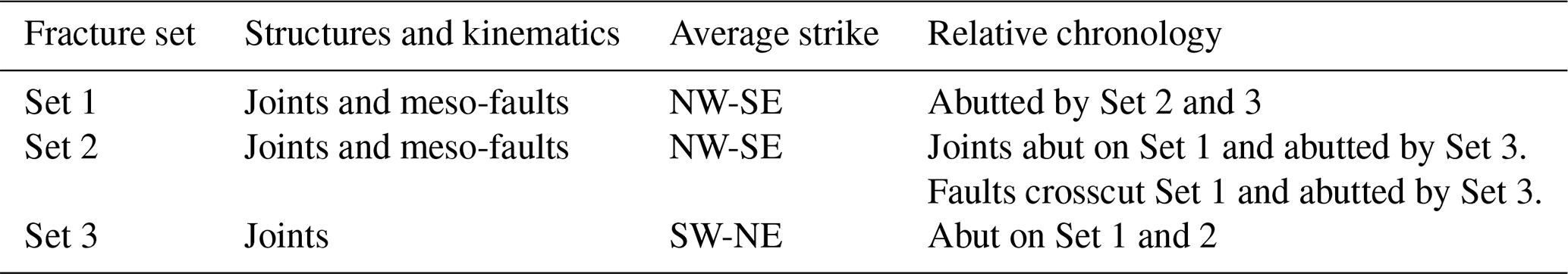 The quarry is carved into the shallow marine intertidal limestones of the Calcare di Altamura Formation (Coniacian to Early Campanian, Panza et al., 2016). Limestones are well-stratified light-brown mudstones, with wackestone-packstone layers at the bottom of the beds and sometimes algal laminites in the upper parts. Strata are 20–60 cm thick and are organized in thickening upward cycles, some meters thick, bounded at the top by major surfaces of subaerial exposure. Bed interfaces often consist of stylolites having teeth both perpendicular to the folded bedding and tangential (slickolites). The outcrop shows three main fracture sets and a set of “major” structures, that are actually major at the outcrop scale, but negligeable at the regional scale (Fig. 2b). Set 1 is the most persistent, it is NW-SE striking and, based on abutting relationships, predates all the other sets (Table 2). It presents both joints and meso-faults with a vertical displacement up to a few cm. Set 2 is also striking NW-SE on average, but with a wider scatter, and it also includes both joints and strike-slip meso-faults. However, structures belonging to Set 2 always abut on those belonging to Set 1, showing that Set 2 is younger (Table 2). Set 3 is NE–SW striking and includes fractures that abut on those belonging to both Set 1 and 2. The trace of these fractures, that are limited by older structures, are relatively short, but are responsible of most of the connectivity of the network (Table 2). Aside from the geometrical characteristics, veins are absent in all of the three fracture sets, as well as fibres on small faults (Set 1 and Set 2).