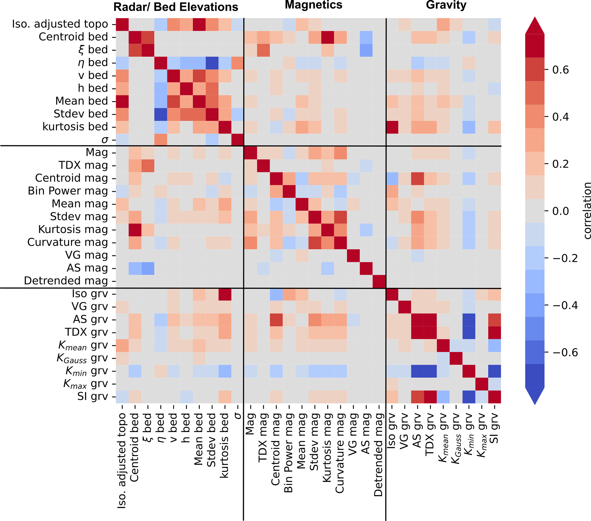 We first examined correlations between individual attributes (Fig. 4). Particularly high correlations or anticorrelations indicate how different datasets are affecting each other, and which ones can be used jointly in an interpretation. The correlation matrix between the attributes shows that, in general, the correlation is strongest between attributes derived from the same data type (radar, magnetic, or gravity), as expected. Some of the attributes do not follow this general observation. E.g., the Tilt-Derivative of the gravity (TDX grv) correlates stronger with radar roughness than with any other gravity-derived attribute. Roughness reflects, first of all, variations in the topography itself. Such a varying topography will cause variations in the gravity signal and, to a minor extent, the magnetic signal. This is evident in the correlations between roughness and spectral attributes in magnetics, as well as with the gravity signal, which may indicate that a smooth bed-ice transition tends to be less dense and has lower susceptibility.