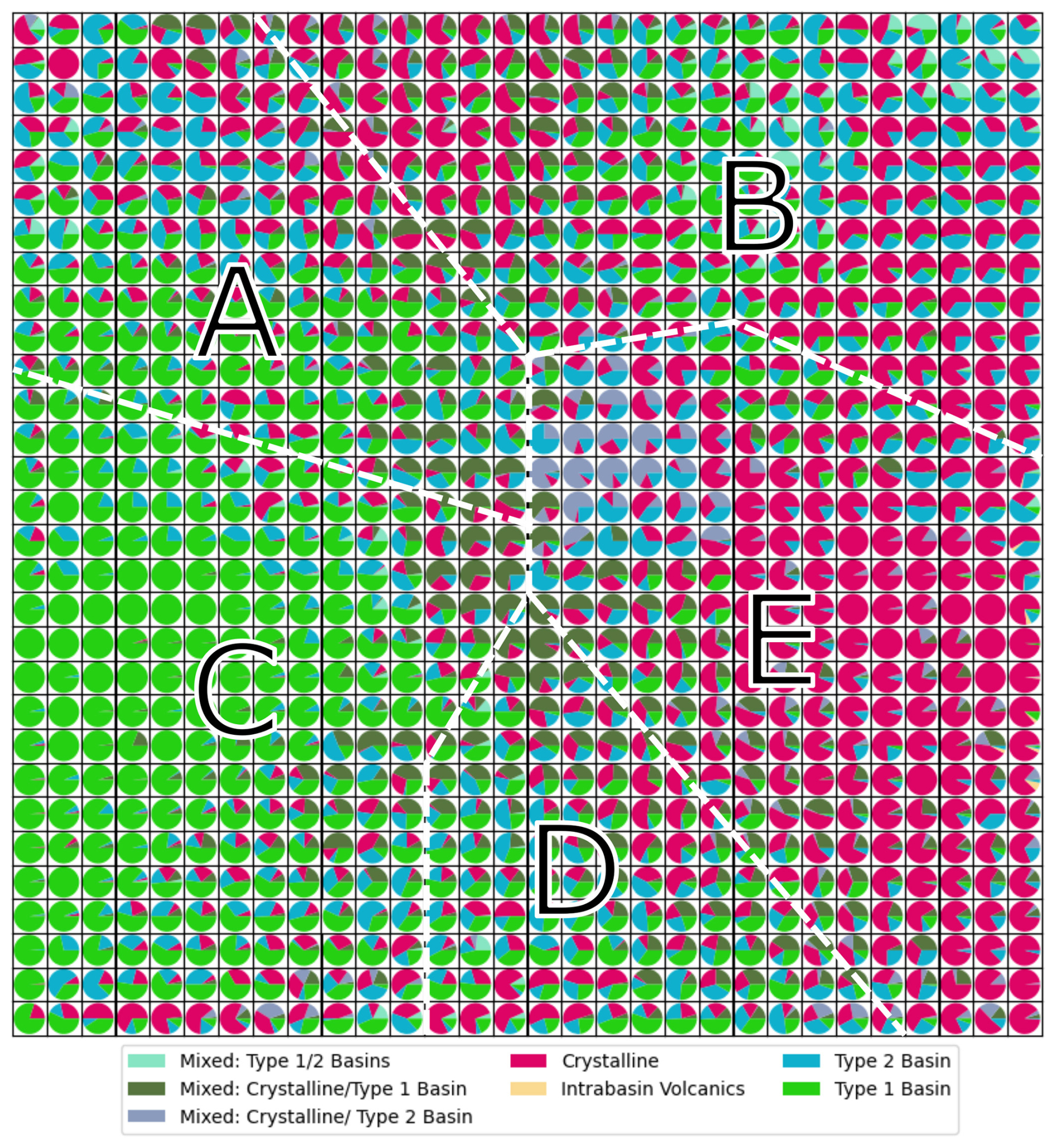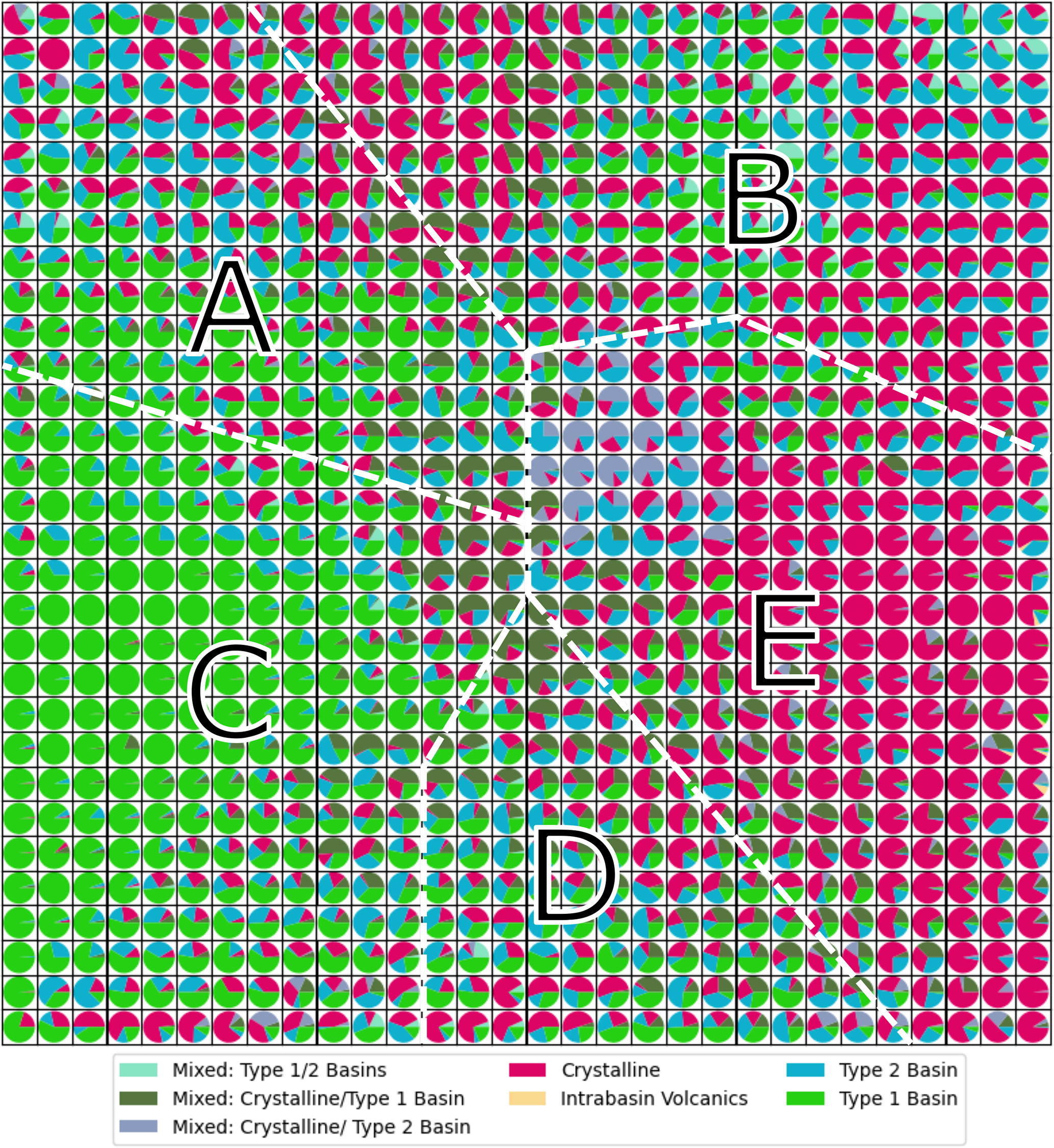 The crystalline-basement class indicates where the bed is interpreted to consist of igneous or metamorphic rocks (including high-grade metasedimentary rocks), with either no or only a thin veneer of sedimentary cover. Typically, these regions possess the characteristics of high elevation and high gravity with high spatial variability in topography, gravity, and magnetic data. Type 1 basin class represents regions where sedimentary basins are preserved in relatively unmodified basins, with typical characteristics of low elevation and low gravity, and low spatial variability in gravity and magnetic data. Along-track roughness tends to be low. The intra-basin volcanics class includes areas where volcanic rocks are interpreted to be emplaced within a Type 1 basin sequence. Type 2 basin class, in turn, represents areas where sedimentary rocks are known or inferred but the original depositional basin is not preserved. These rocks tend to predate the formation of the present landscape, are often uplifted to high elevations, may be intruded by younger igneous rocks, may be heavily eroded and may have geophysical characteristics more similar to crystalline basement than Type 1 basins. For mixed classes the geophysical characteristics are not providing clear evidence for an assignment to a single class (Aitken et al., 2023). We expect our SOM to contribute the most to an improved understanding of the mixed or inconclusive classes. For comparison, we sample for each data point of our SOM its class according to Aitken et al. (2023) shown in Fig. 6. The datapoint can then be mapped into the two dimensions of the SOM. The pie chart for each cell of our map represents the different classes mapped to it, e.g., association with Type 1 basins and Crystalline Basement is dominant on the left and right side, respectively, while most cells sample different domains and can be less clearly associated with a certain class. As the SOM is mapping data firstly in a 2D Domain based on attribute similarity and irrespective of the geographic location (see inset in Fig. 7), the domains A to E seen in Figs. 6 and 7 are only to guide visual comparison and are not based on a statistical evaluation of the results.