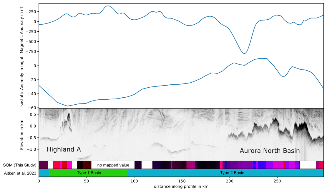 Along a flight line (Fig. 9), the interpretation by Aitken et al. (2023) does not clearly follow the boundaries visible in the data and SOM. The radar data show that there are sections of the basin where no return from the bed was detected (e.g., distance ∼ 100 km), while it appears as a very smooth reflector in places where it was detected (∼ 140 km). Additionally, the magnetic signal exhibits a predominantly long wavelength above the basin and shows no obvious correlation with the bed. These observations indicate the presence of non-magnetic rocks near the bed. The SOM effectively captures the abrupt change at the rise of Aurora North Basin in the north of the profile (Fig. 9). For clusters B and E, the correlation between the magnetic signal and bed elevation becomes evident. This suggests the presence of magnetic rocks near the surface of Aurora North Basin, whereas it is not the case in the Aurora Basin. This illustrates how the SOM can successfully integrate information from various data types into a single parameter, clearly highlighting the most probable geological boundaries. It therefore could be a useful tool for future mapping attempts and could also help adjust boundaries while leveraging all available data types.