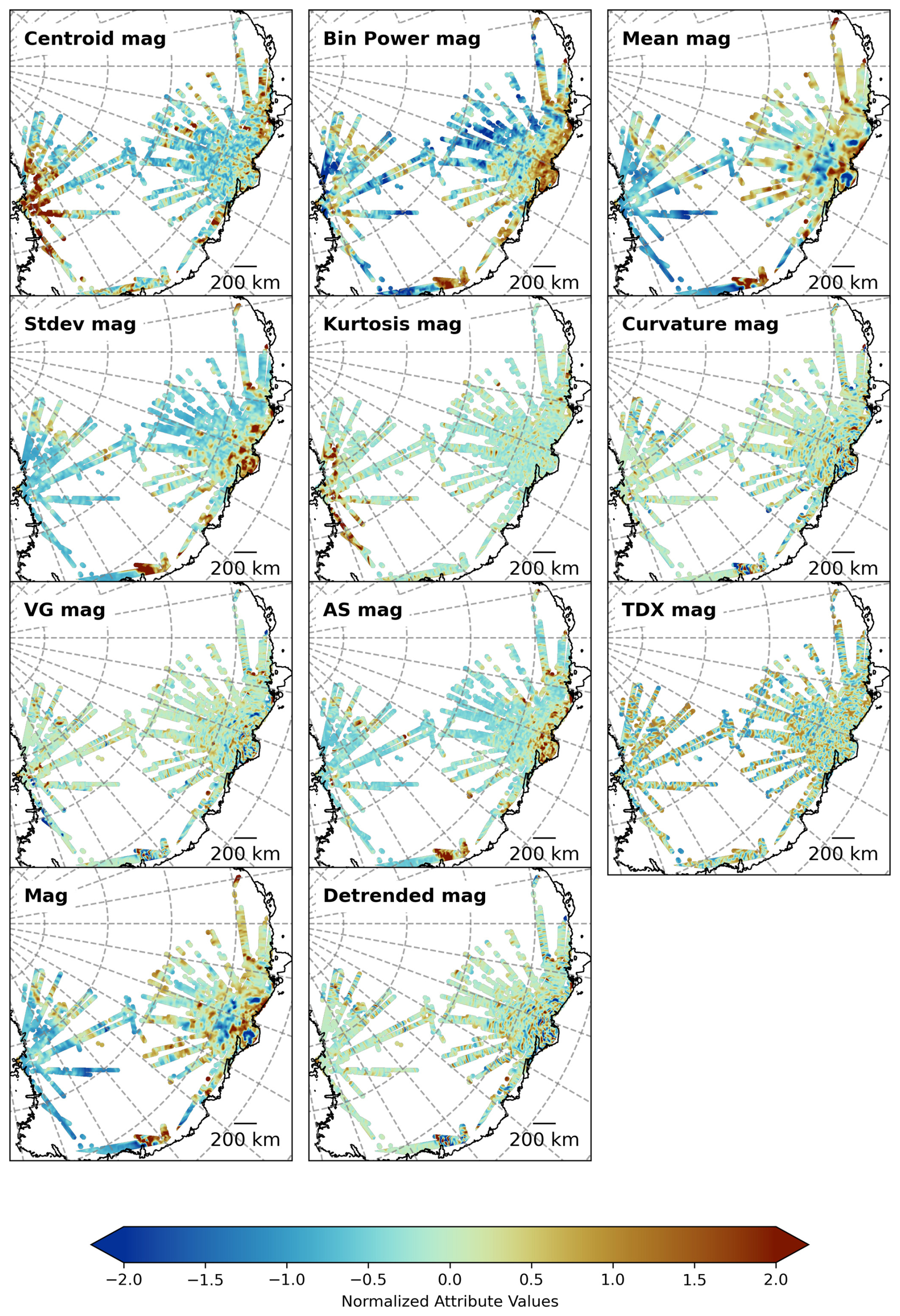 For the magnetic data, 11 attributes were computed along the flight lines (see Fig. A2). Since there are some data gaps, certain attributes are also computed in the spectral domain, using a window with a length of 40 km. These attributes are standard features used to describe the magnetic field. See Blakely (1996) or Li (2015) for more details.