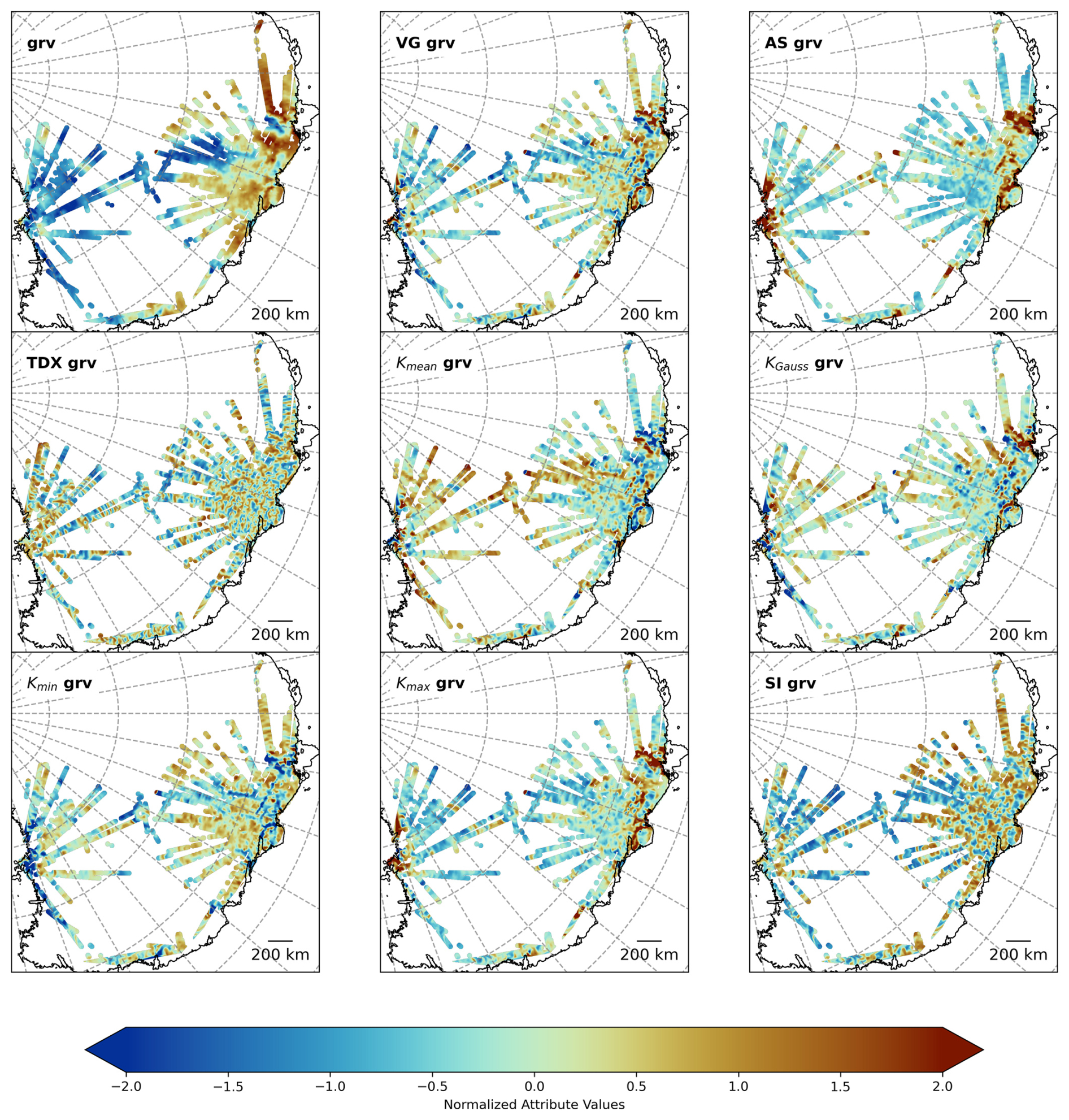For the gravity data, 9 attributes (see Fig. A3) were computed from the grids, not along the flight lines. As we have gridded data, the derivatives are calculated using an equivalent source approach with prisms as source bodies. The prisms extend from the ice bed to a depth of 10 km. The densities of the prisms are estimated by inverting the gravity field of Scheinert et al. (2016). From these prisms, all spatial derivatives can be forward calculated following Nagy et al. (2000). For the curvature attributes, we are following Li (2015), where the full mathematical background, tests with synthetic data, and an evaluation of these attributes for airborne gravity gradients can be found. See also Ebbing et al. (2018) for an example of curvature attributes from satellite gravity data over Antarctica.