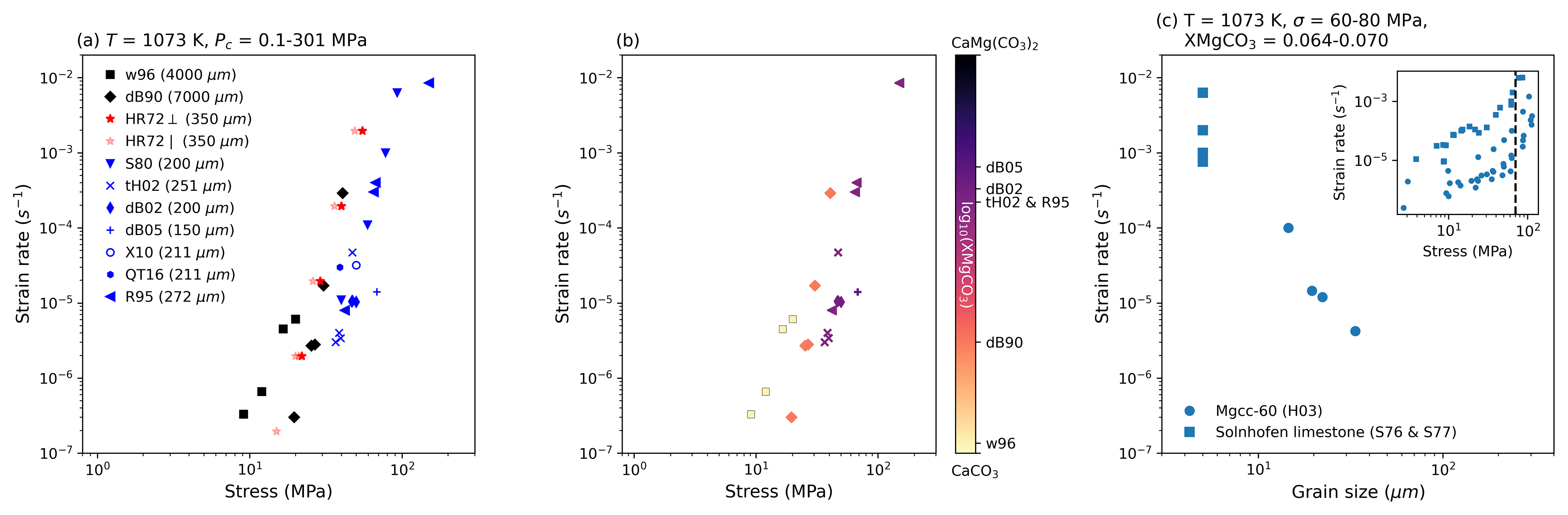 Figure 2A starting point for evaluating carbonate rheology (see Table 3 for references and experiment abbreviations). (a) visualises the core observation for the current understanding of calcite rheology, rocks are stronger for smaller grain sizes (cf. Renner and Evans, 2002). Data is colour coded by material: black = Iceland spar; red = Yule marble; blue = Carrara marble. (b) shows an alternative trend where a rock strengthens with magnesium. (c) highlights a consequence of this observation, that grain size actually has a weakening effect if data are observed at a fixed magnesium content. The dashed line in the inset highlights the stress at which grain size is evaluated in the main plot of (c).