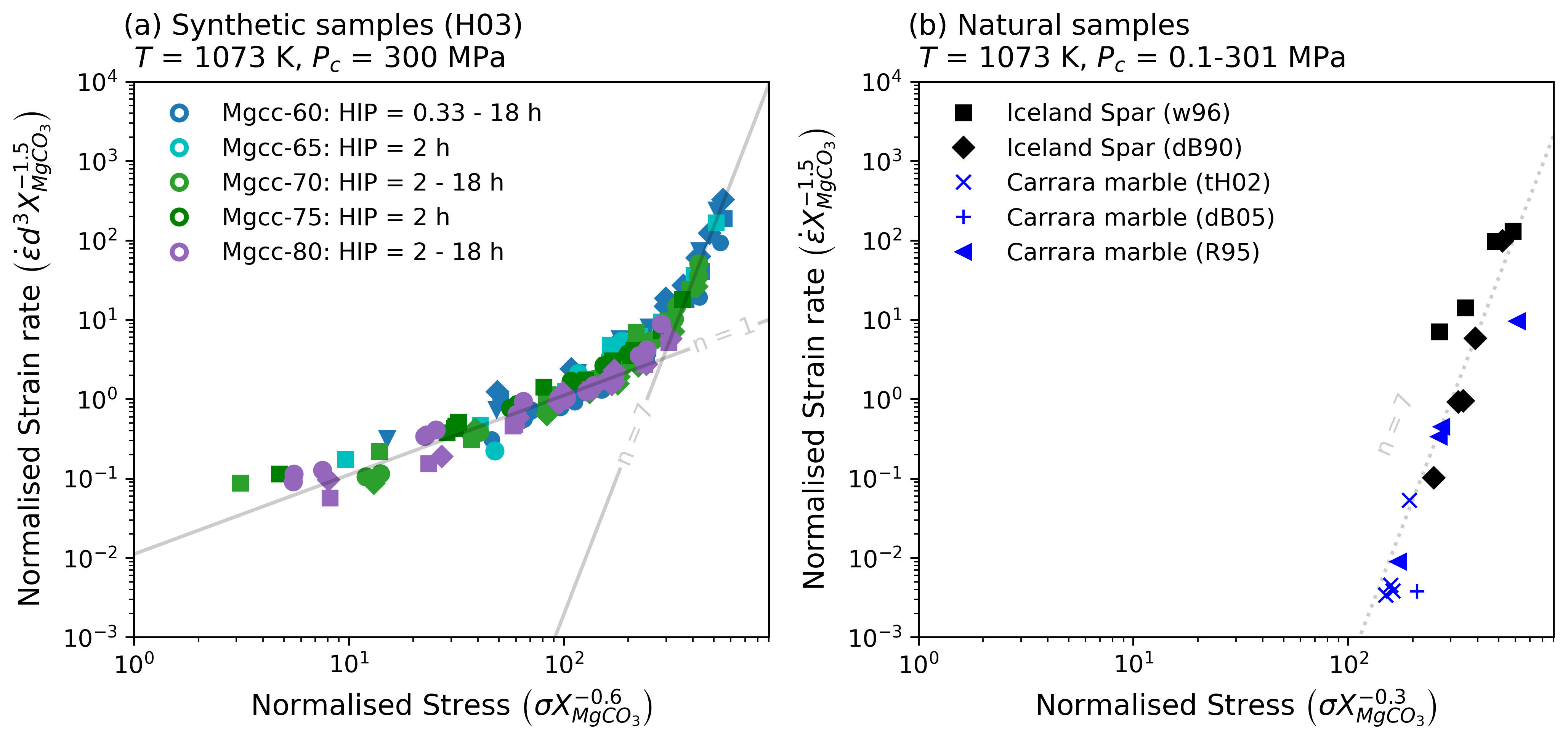 Figure 3An example of normalising data. (a) shows a selection of synthetic Mg-calcite experiments from Herwegh et al. (2003) that then have each data points strain rate normalised by the sample grain size to the power of 3 in (b). The power of 3 is the reciprocal exponent to that expected for a constitutive relation governed by grain boundary diffusion.