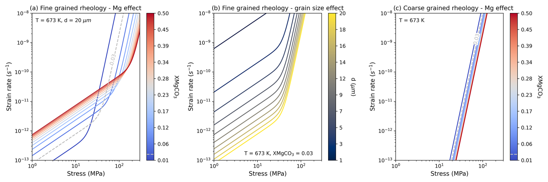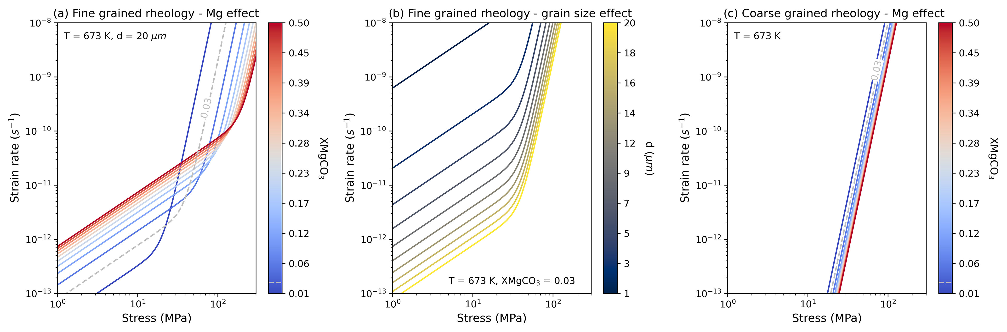 Substituting power-law flow laws for diffusion and dislocation creep gives us the following grain size and XMgCO3 sensitivities: