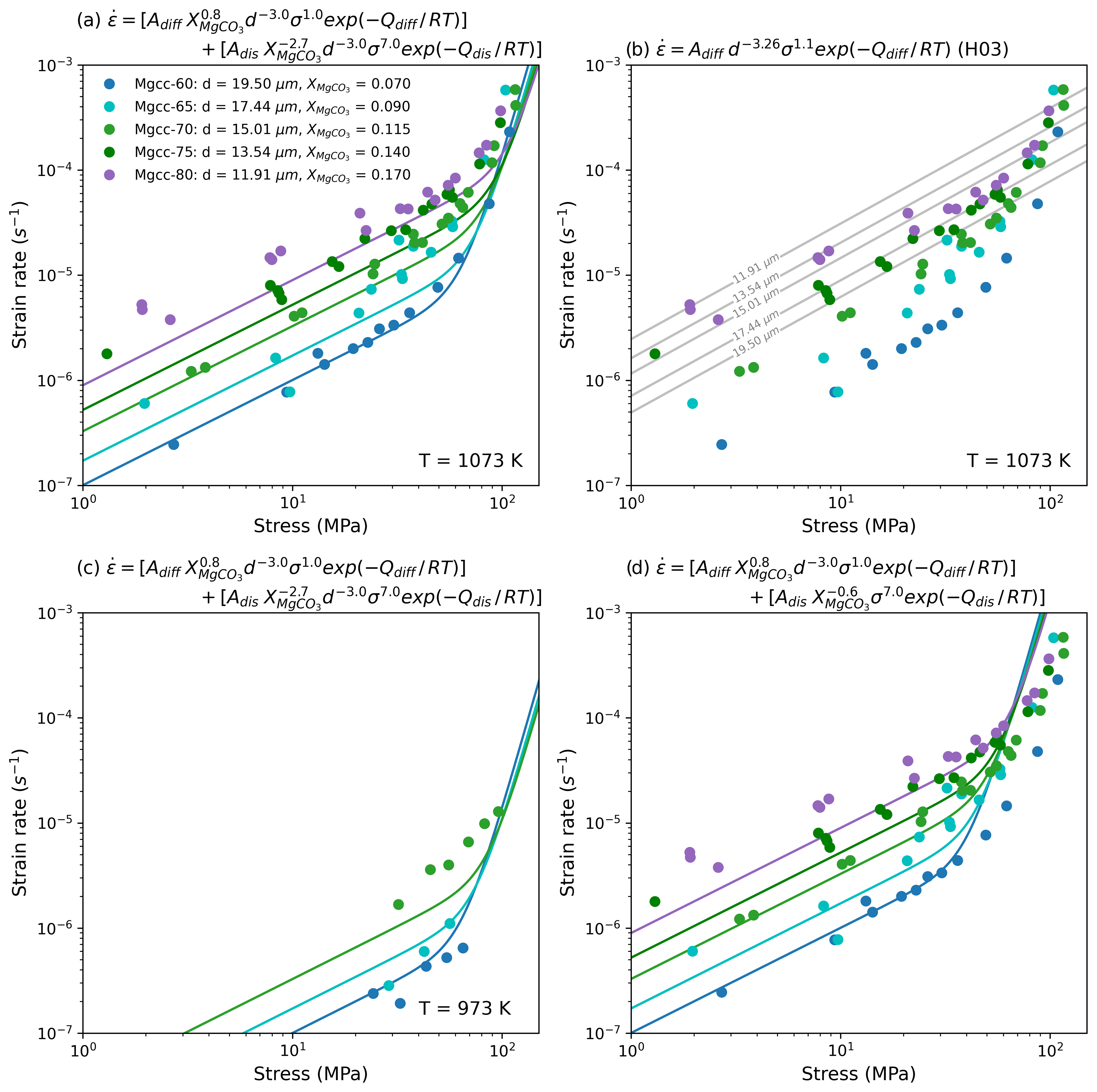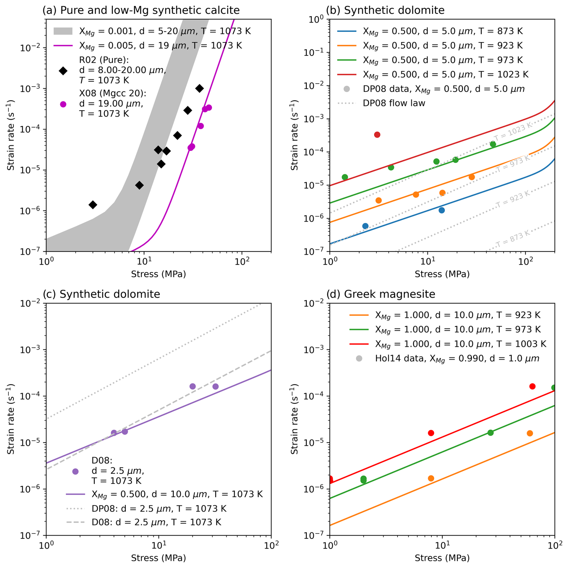 The two biggest limitations of our contribution are that we can neither provide an underlying microphysical model nor uncertainty estimates for parameters. Regarding uncertainty, some of this limitation is unavoidable as not all experimental data we revisit can report errors or the kind of errors cannot be compared. The most complex parameter to compare between datasets is grain size and it is unclear if one would obtain a sensible error from propagating what is available in the literature. Beyond this future work may try and use a more sophisticated method to fit for exponents which could give fitting errors. Despite this, our first attempt seems to provide flow laws that can replicate a wide range of carbonate experiments. As for accounting for a microphysical model, this is particularly challenging because our data show that the underlying deformation mechanisms need to account for both the effect of magnesium and a grain size weakening dislocation creep. Across the 24 publications we revisit microstructures are not always provided and as such we cannot unequivocally establish if other processes like twinning are significantly impacting strength and grain size adjustments at high homologous temperatures in the data we revisit (cf. Rybacki et al., 2021). We assume that any mixed activity of processes that effect grain size and strength ultimately homogenise to give us our observed bulk grain size sensitivity in dislocation creep (d−3). In light of our above discussion, the best starting point would appear to be to build on the work of Breithaupt et al. (2023) and include a physically sensible magnesium dependence.