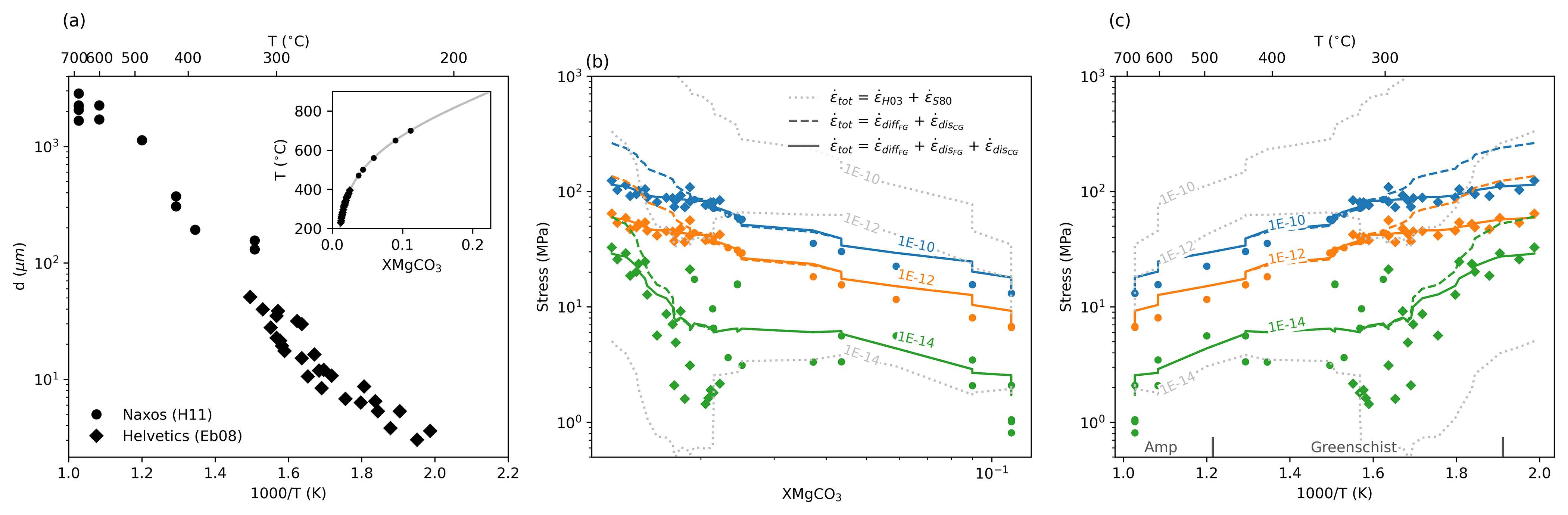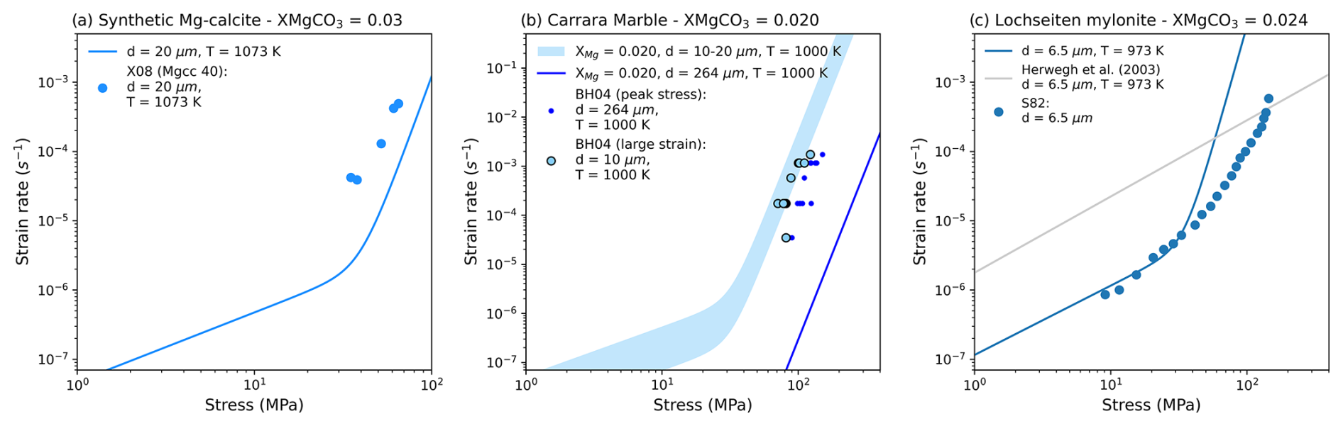 We identified three experiments with similar XMgCO3 values that can be used to understand how well Eqs. (6)–(7) model the rheology of carbonates with contrasting grain size controls: statically grown grain size (Fig. 8a) (Xu et al., 2008), a dynamically recrystallised grain size (Fig. 8b) (Barnhoorn et al., 2004) and a second phase controlled grain size (Fig. 8c) (Schmid, 1982).
