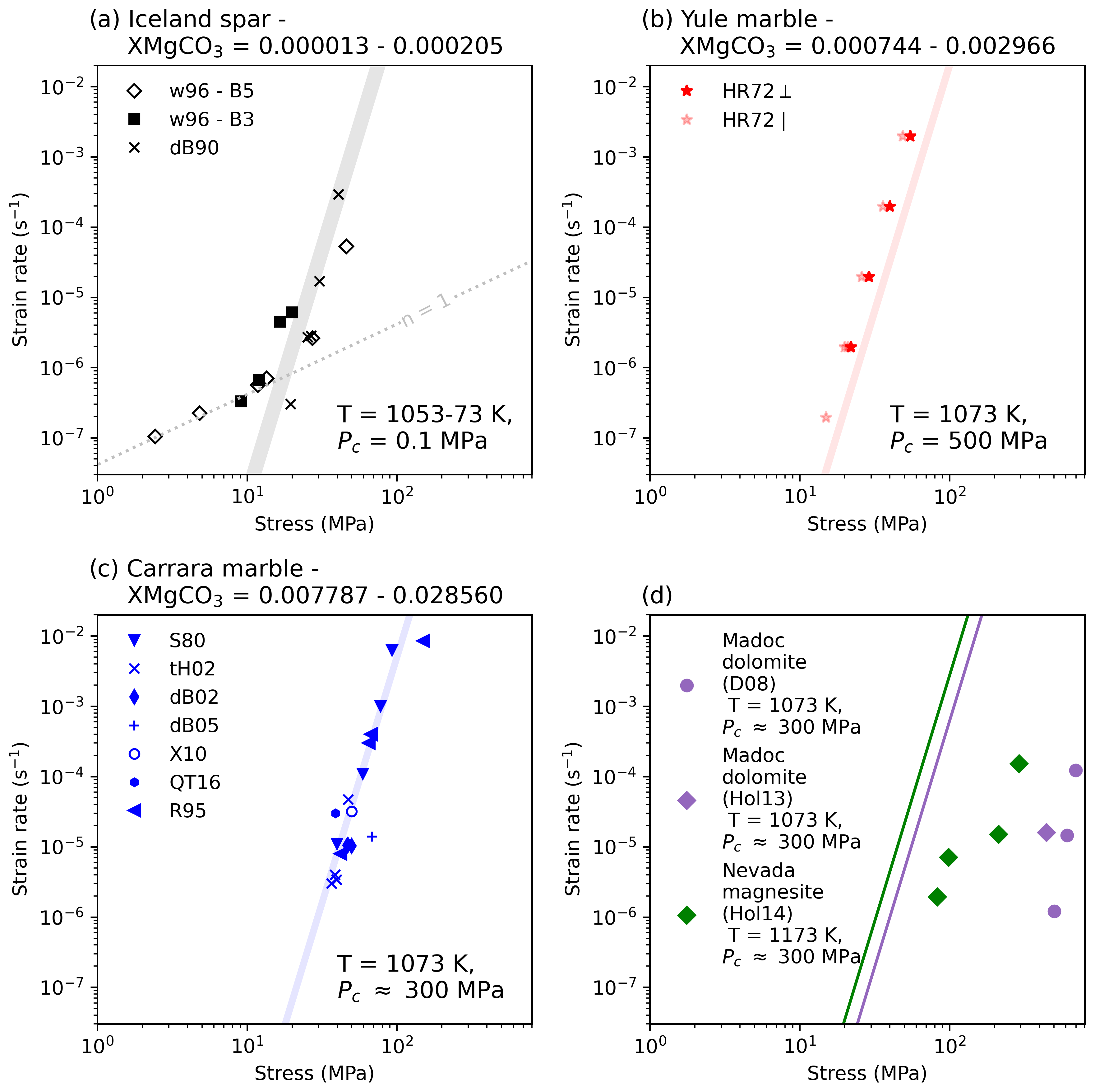 Figure 10Exploring how well the coarse grained flow law fits both the data it was fit from and other data where Mg is known for the material but not the experiment itself. Shaded areas use the max and min XMgCO3 values to bracket the possible rheology. Dolomite and Magnesite are modelled as XMgCO3 = 0.5 and 1.0. Please refer to Table 3 for experiment abbreviations.