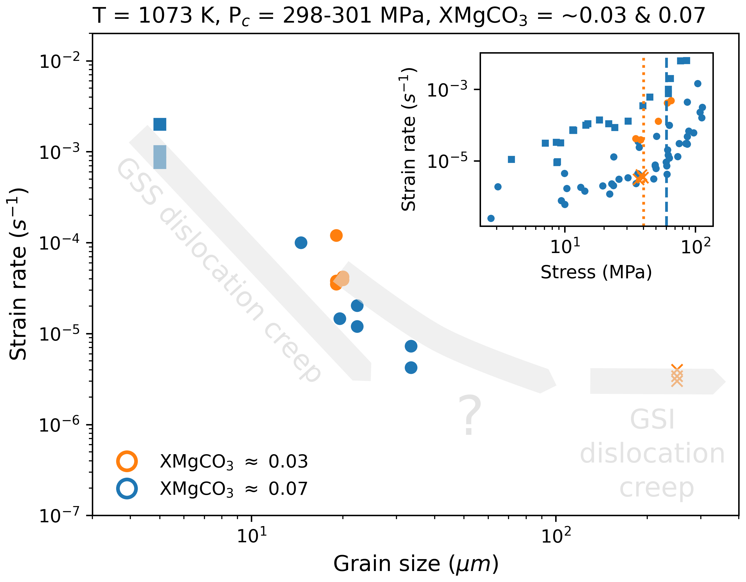 Regardless of the underlying reasons, what is clear is that our fine grained calcite data cannot be modelled well with a grain size insensitive dislocation creep rheology and some component of grain size sensitivity is needed. Short of adapting the model of Breithaupt et al. (2023) to include the effect of XMgCO3, one could be pragmatically guided by Fig. 11 to explicitly model different rheologies based on grain size domains.