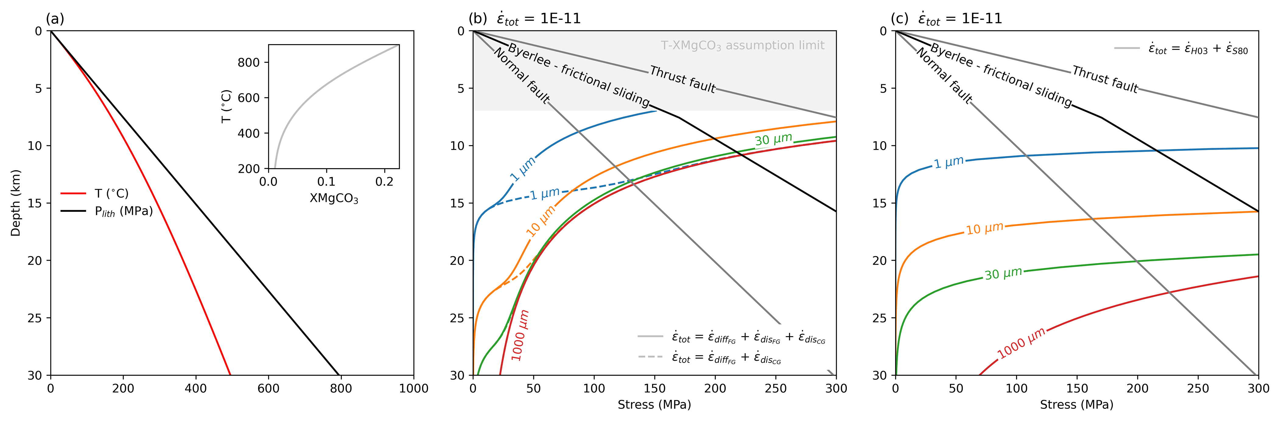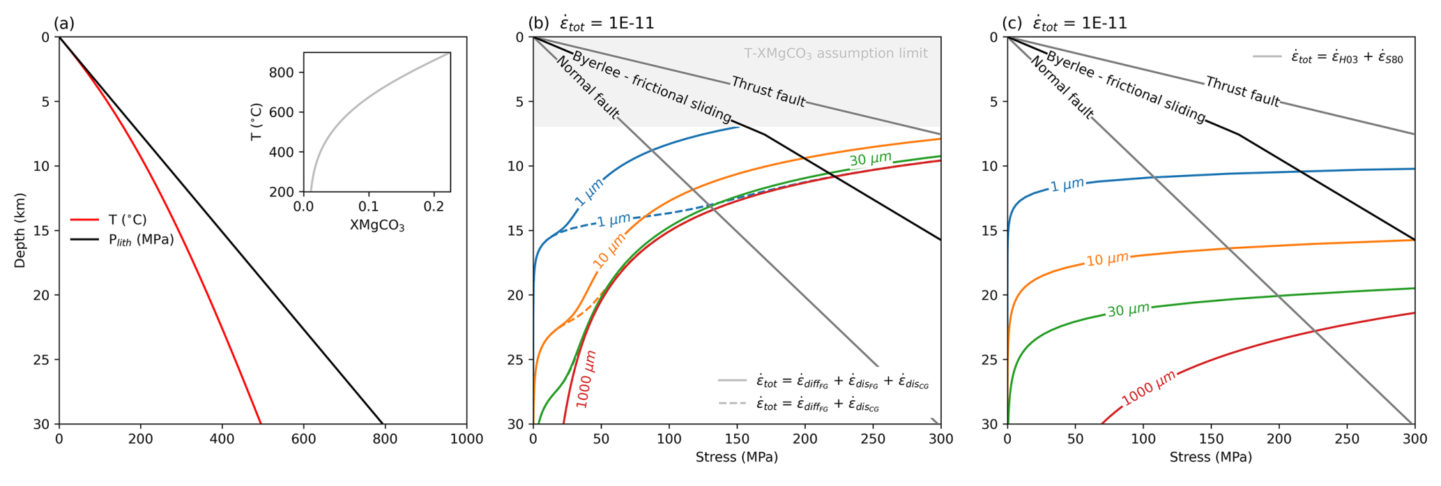 Figure 12Modelling crustal strength for a given temperature-pressure-depth-XMgCO3 profile (a). The reference stress state with depth is Plith = ρgz. The geotherm is calculated following an assumed constant heat flow in a stable continental crust (cf. Stüwe, 2007, Eq. 3.70: hr = 10×103 m, S0 = 3 Wm−3, zc = 30×103 m, qm = 0.025 Wm−2, C2 = 300 K). The calcite-dolomite carbonate solvus of Anovitz and Essene (1987) is used to relate T and XMgCO−3. (b) shows the strength for various grain sizes using two combinations of the three flow laws obtained (Eqs. 6–8). (c) shows how strength changes using a composite flow law made up of previously published dislocation and diffusion creep rheologies (Schmid et al., 1980; Herwegh et al., 2003). Frictional strength envelops are given by Byerlee's law for frictional sliding (Byerlee, 1978) and Sibson (1974), assuming μ = 0.75 and λ = 0.5.