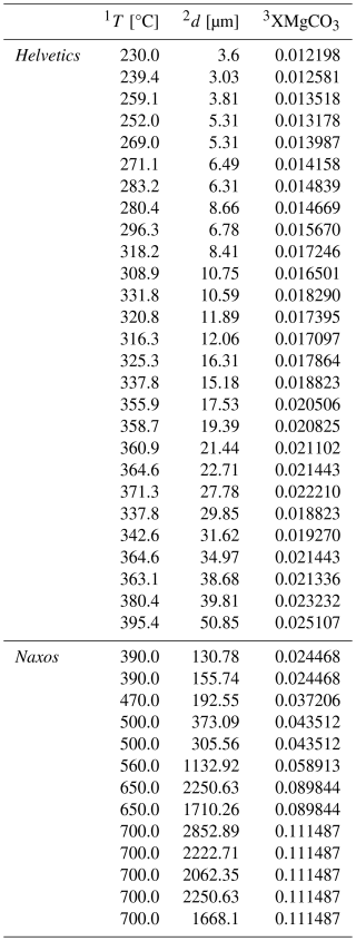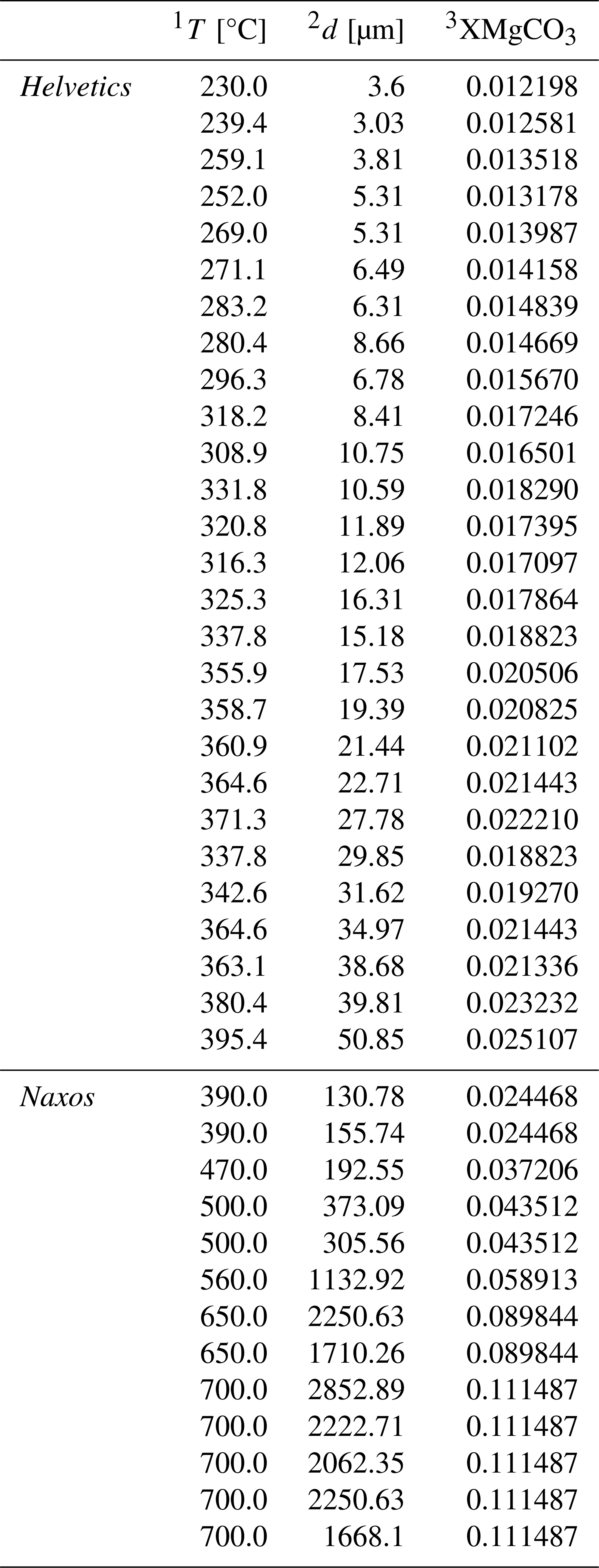 1 T = deformation temperature, 2 d = grain size, 3 XMgCO3 = molar fraction of MgCO3 converted from T.