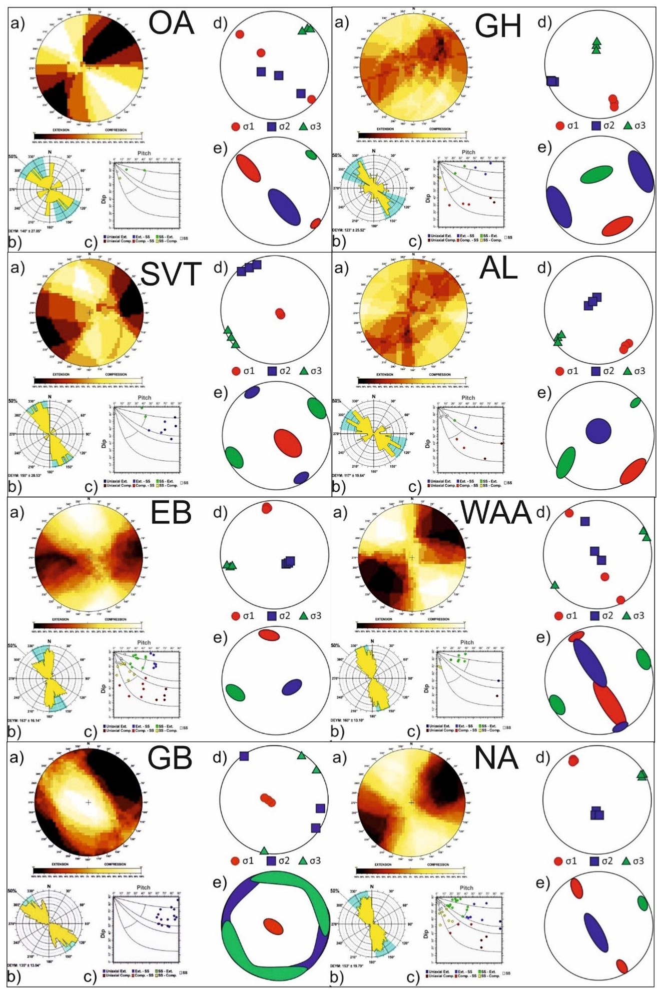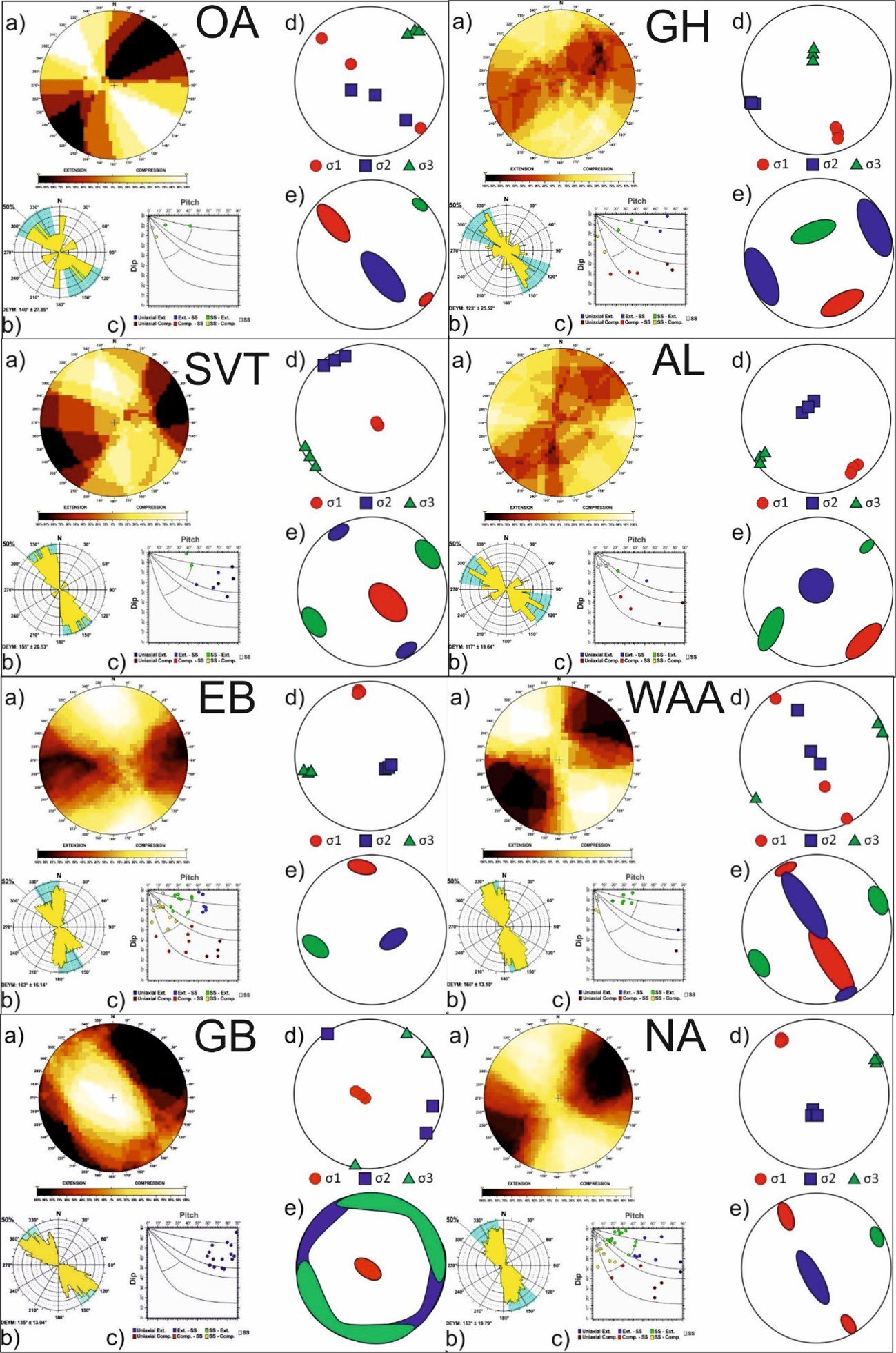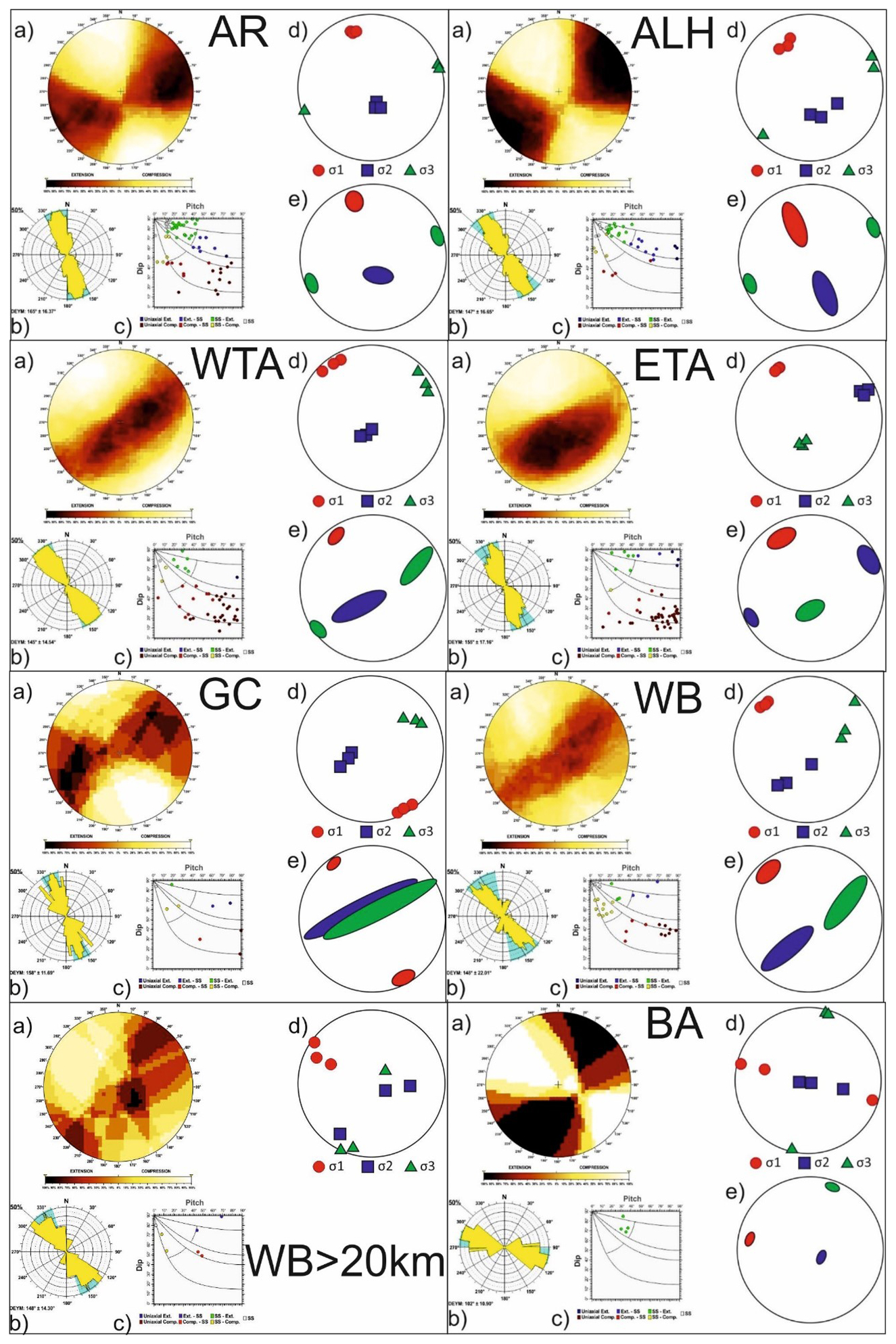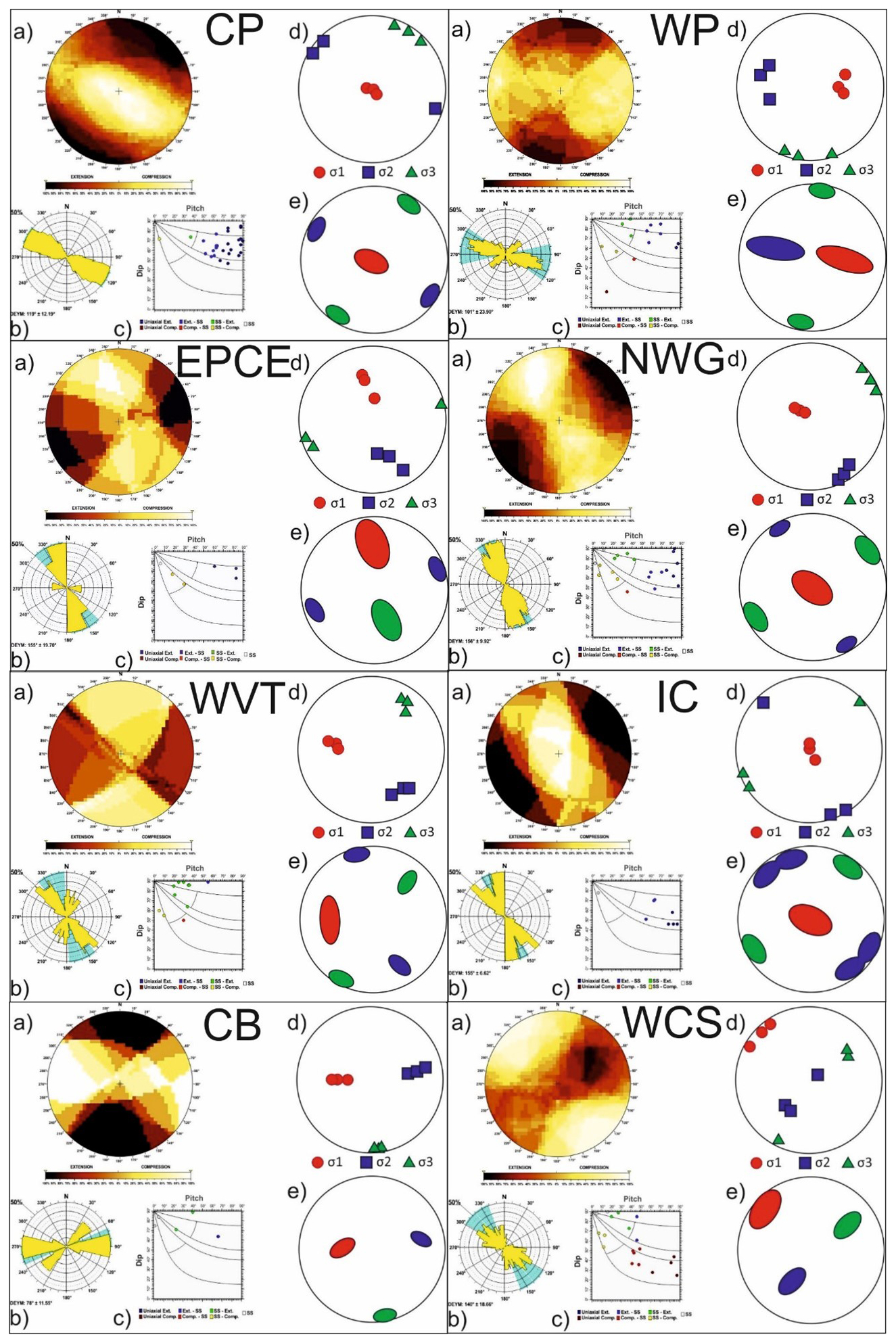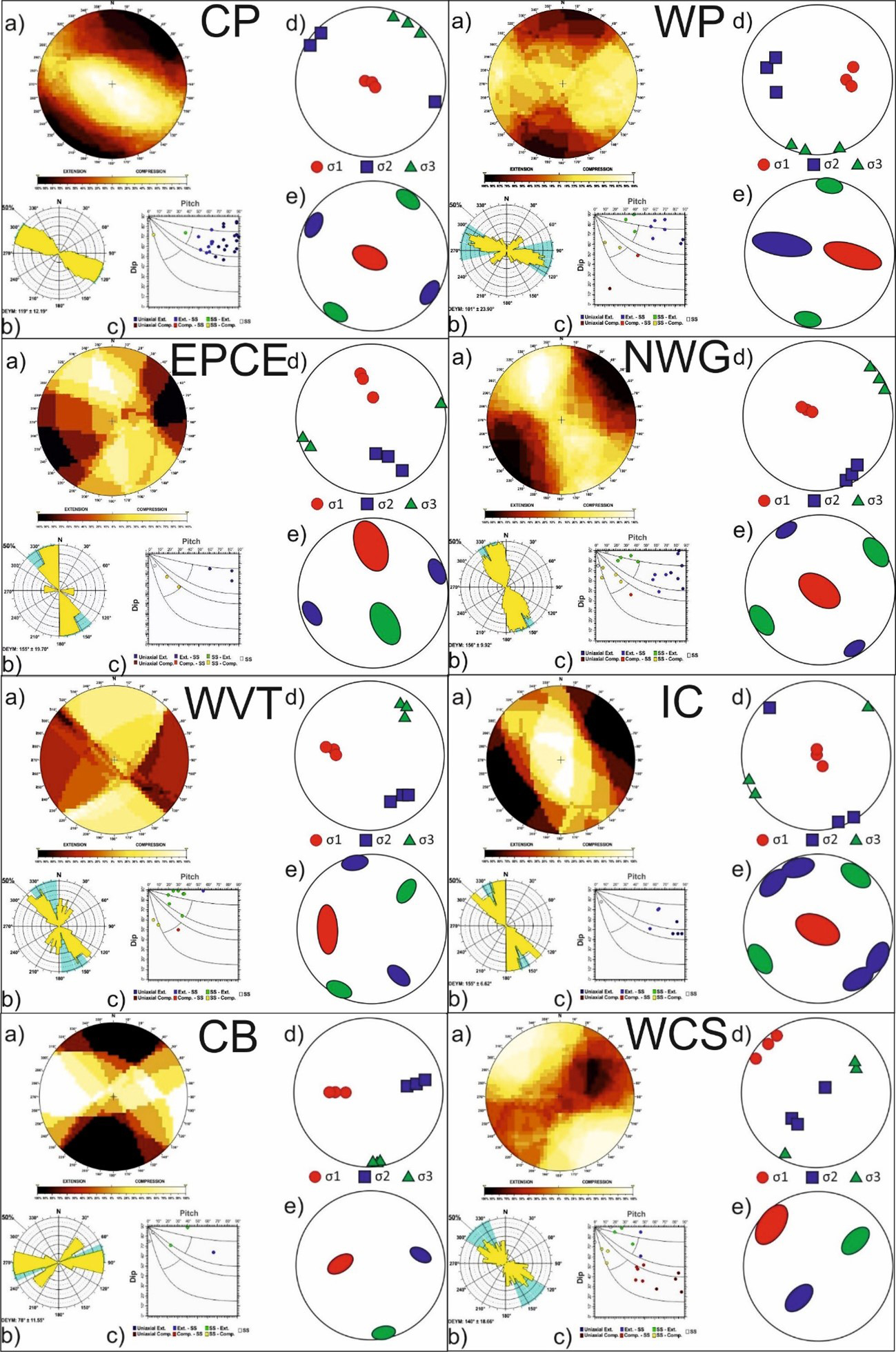 Figure 6Results of the stress–strain analyses for different zones: (a) right dihedra solution, (b) rose diagram of the Deys obtained from the slip model, (c) pitch/dip plot for the neo-formed nodal planes obtained from the slip model, (d) stress inversion results, (e) variability in the three principal stress axes of the stress inversion. CP Central Pyrenees; WP Western Pyrenees; EPCE Eastern Pyrenees–Northern Catalan Coastal Range; NWG Northwestern Galicia; WVT Western Valencia Trough; IC Iberian Chain; CB Central Basins; WCS Western Spanish–Portuguese Central System.