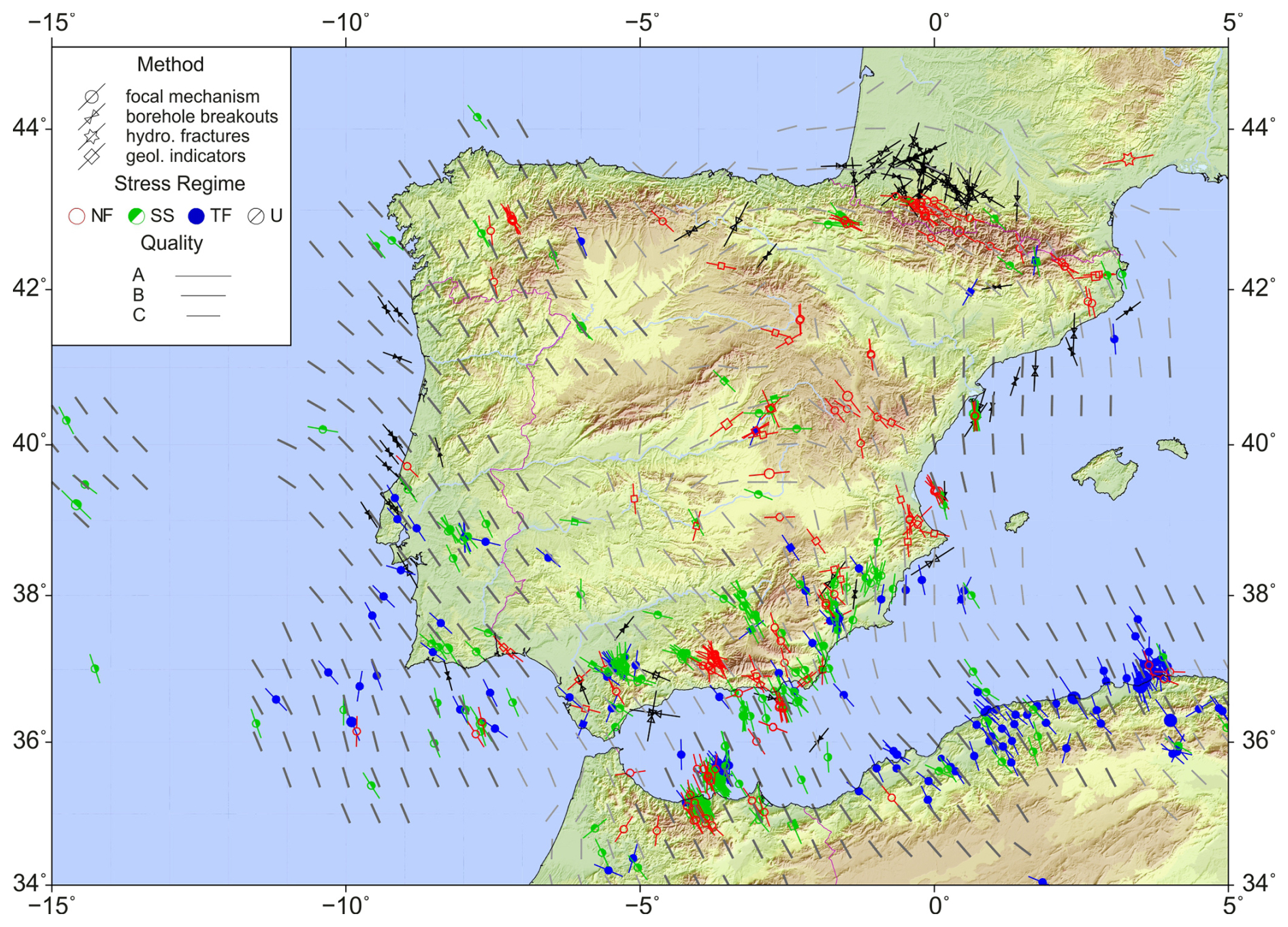 Today, extensional structures dominate the easternmost part of the Iberian Peninsula (since the Late Miocene) due to back-arc extension related to a subduction zone below Corsica and Sardinia (e.g. Faccenna et al., 2002), initially a part of the Iberian microplate (van Hinsbergen et al., 2014). A normal faulting stress regime, unrelated to plate tectonics, also affects the Pyrenees, where a post-orogenic collapse process has been suggested (Asensio et al., 2012). The active plate boundary is considered to have progressively migrated southward from its initial position to the north, when Iberia acted as an independent, to its current configuration along the southern margin of the Iberian Peninsula (Terceira Ridge–Gloria Fault–Alboran Basin–Tell Atlas). This tectonic reorganisation coincided with the integration of Iberia into the Eurasian Plate. The resulting geodynamic setting is characterised by a diffuse plate boundary encompassing the Betic Cordillera, where coeval compressional and extensional tectonic regimes are accommodated. These processes are primarily governed by the westward migration and emplacement of the Alboran Domain and the ongoing subduction of the southern Iberian margin. In this complex Cenozoic and neotectonic deformation setting, it is unsurprising that the present tectonic stresses in Iberia exhibit significant variations in both the stress regime and the orientation of the principal stress axes (de Vicente et al., 2008) over relatively small areas.