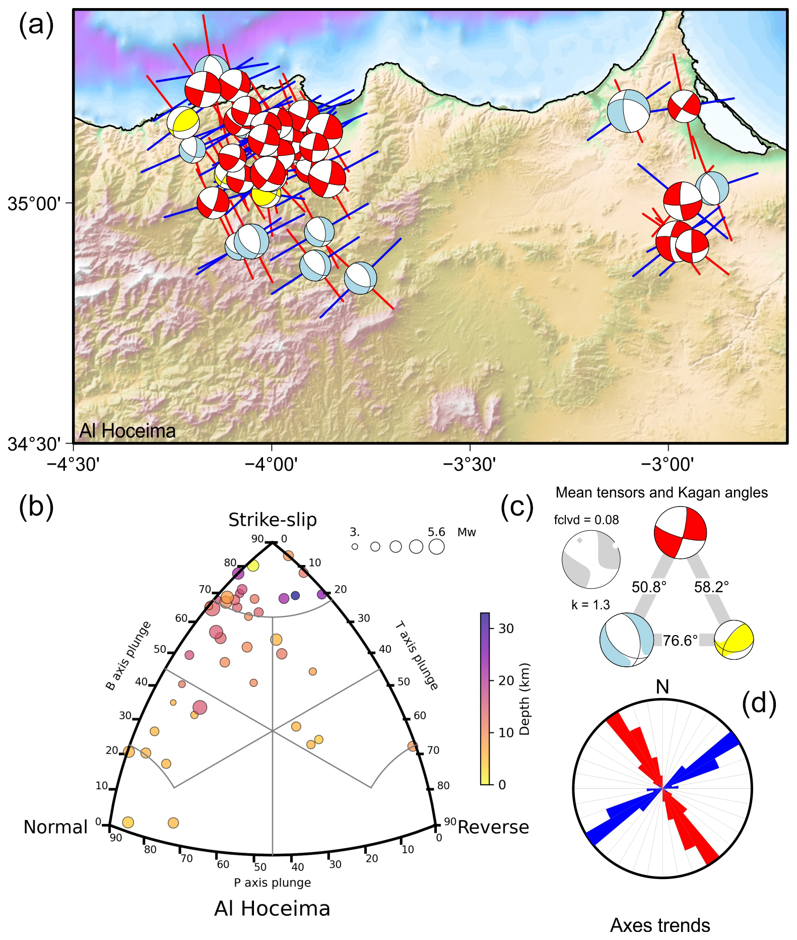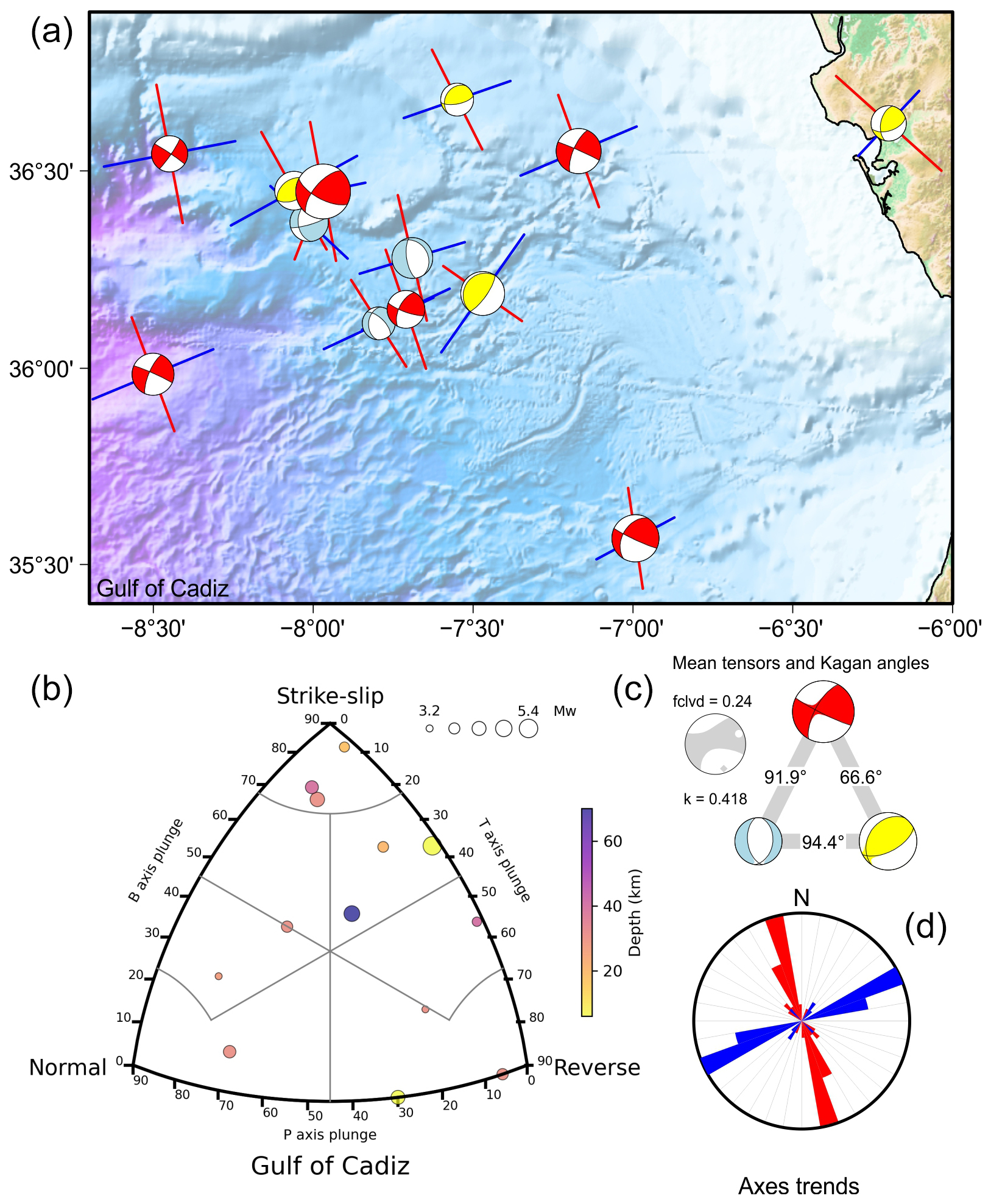 It is of interest to quantify the amount of seismic deformation occurring in each zone using the various rupture types. These different rupture processes within a zone cannot be considered to reflect temporal changes in the regional deformation field, as the time interval of the catalogue is very short; instead, they are likely due to local strain axis permutations. To quantify these changes in the orientation of the axes between rupture types, we resort to the minimum rotation angle between tensors (or Kagan angle; Kagan, 1991). The angle for a pure axis permutation maintaining the orientation of all the axes would be 90°. In practice, if we consider the angle between the focal mechanisms of different types of rupture and given that they nucleate in faults with different orientations, this angle may depart slightly from 90°.