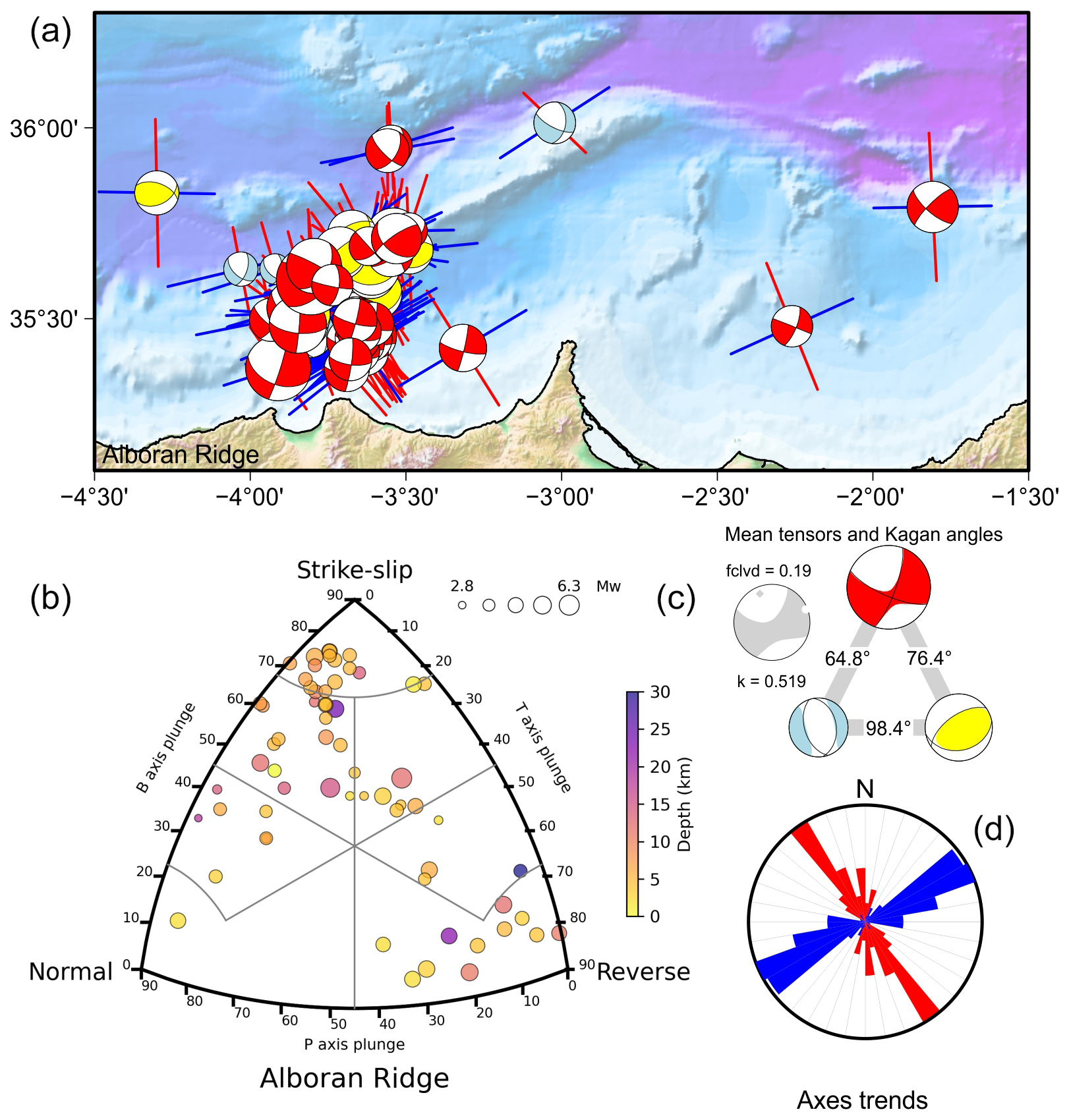 As can be seen in Eq. (3), the summation of the combined rupture types is equivalent to the sum of all tensors. This enables quantification of strain partitioning through the computation of the minimum rotation angle between rupture types, following the method proposed by Kagan (1991).