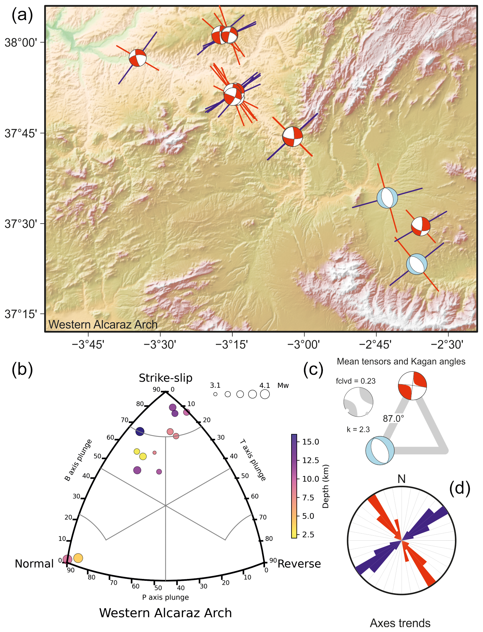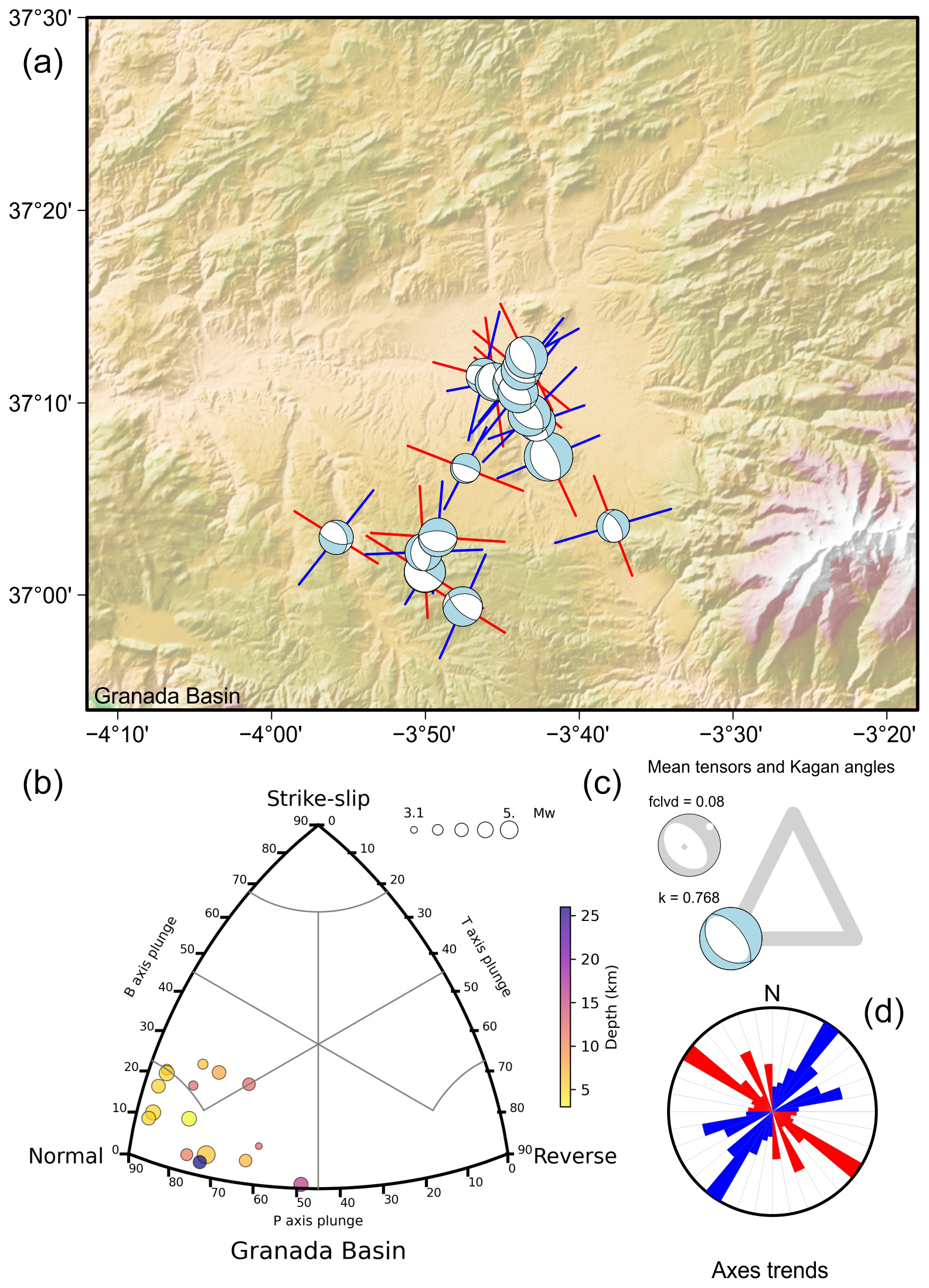 To characterise the tensorial properties of seismicity, two complementary analytical frameworks can be employed: a stress-based approach and a deformation-based approach. In this study, both methodologies are applied to provide a comprehensive understanding of the seismotectonic regime. For the deformation-based analysis, we use two approaches. Firstly, a kinematic classification of rupture types is performed, including the derivation of a combined focal mechanism following the methodologies of Álvarez-Gómez (2019) and Kiratzi and Papazachos (1995). This is complemented by the application of the right dihedra method (Angelier and Mechler, 1977) and the slip model (Reches, 1983), which facilitate the identification of the most probable rupture plane to determine the stress tensor using classical inversion procedures. We also use the methodology proposed by Reches et al. (1992). This approach enables iterative testing of various friction coefficients, validated by angular criteria established by the slip misfit (SLIP) and the principal angles misfit (PAM), as detailed in this section. The methodology has been recently revised and implemented in MATLAB (Busetti et al., 2014; Wetzler et al., 2021).