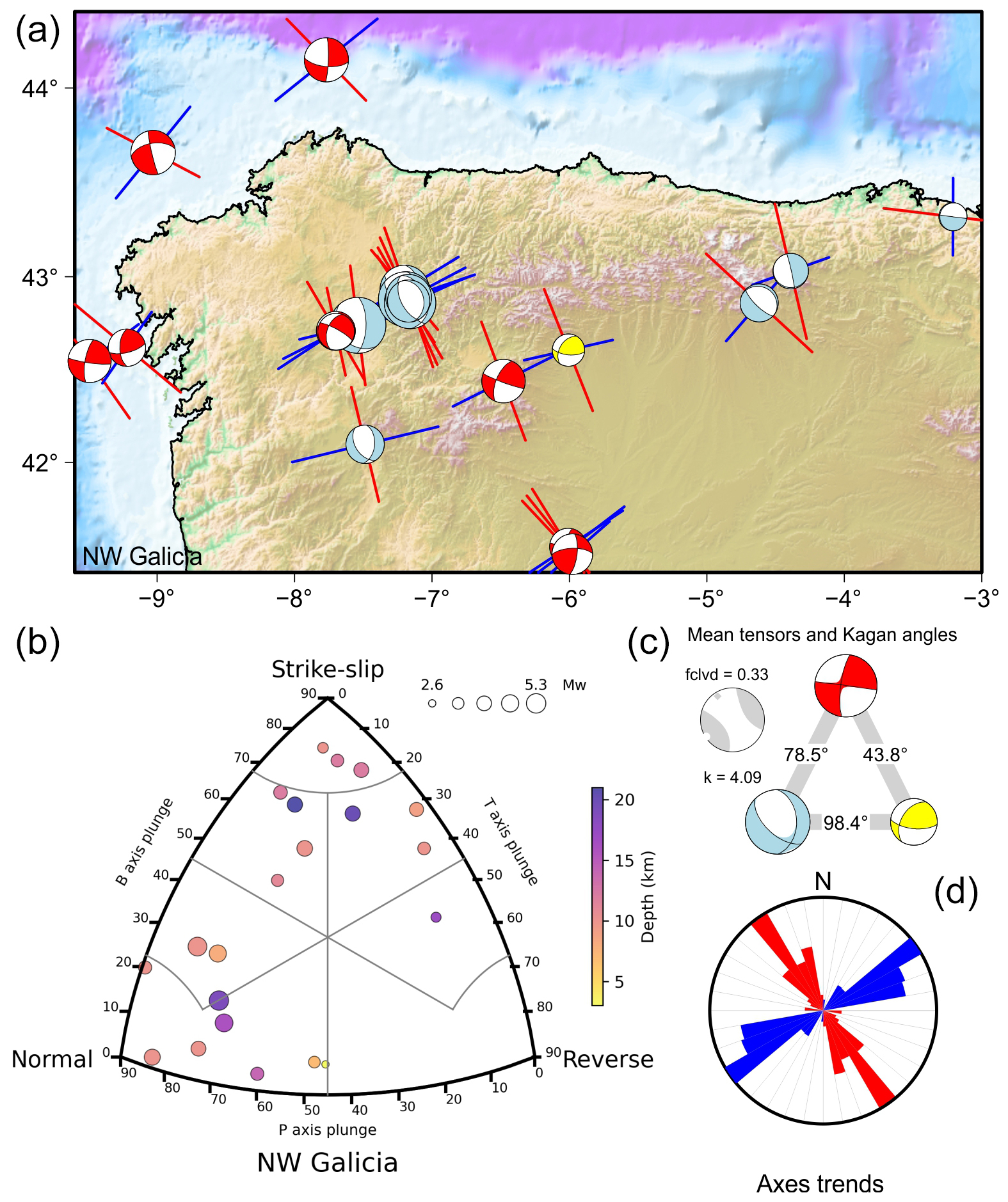 For each tectonic zone, we classified the focal mechanisms by rupture type (reverse, strike-slip, normal) using the focal mechanism classification (FMC) diagram (Álvarez-Gómez, 2019). Then, for each rupture type population, we obtained a combined focal mechanism by averaging the moment tensor components following the approximation of Kiratzi and Papazachos (1995):