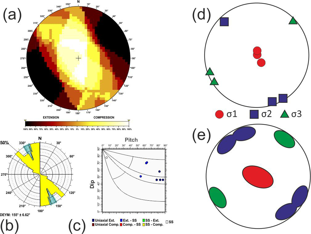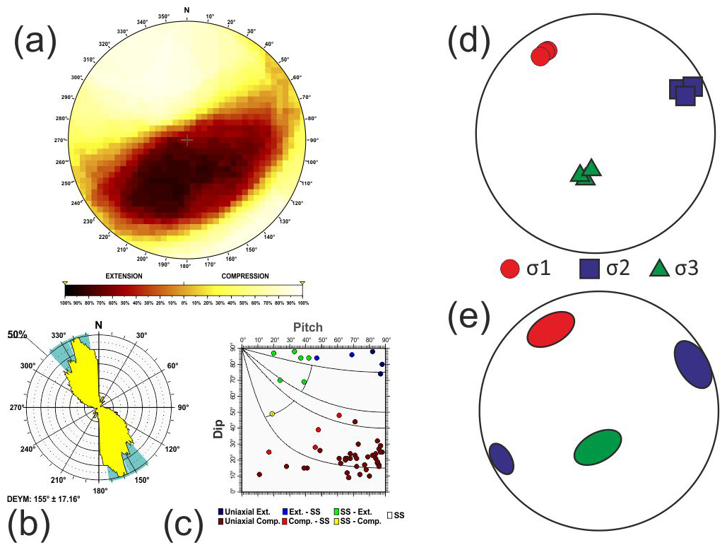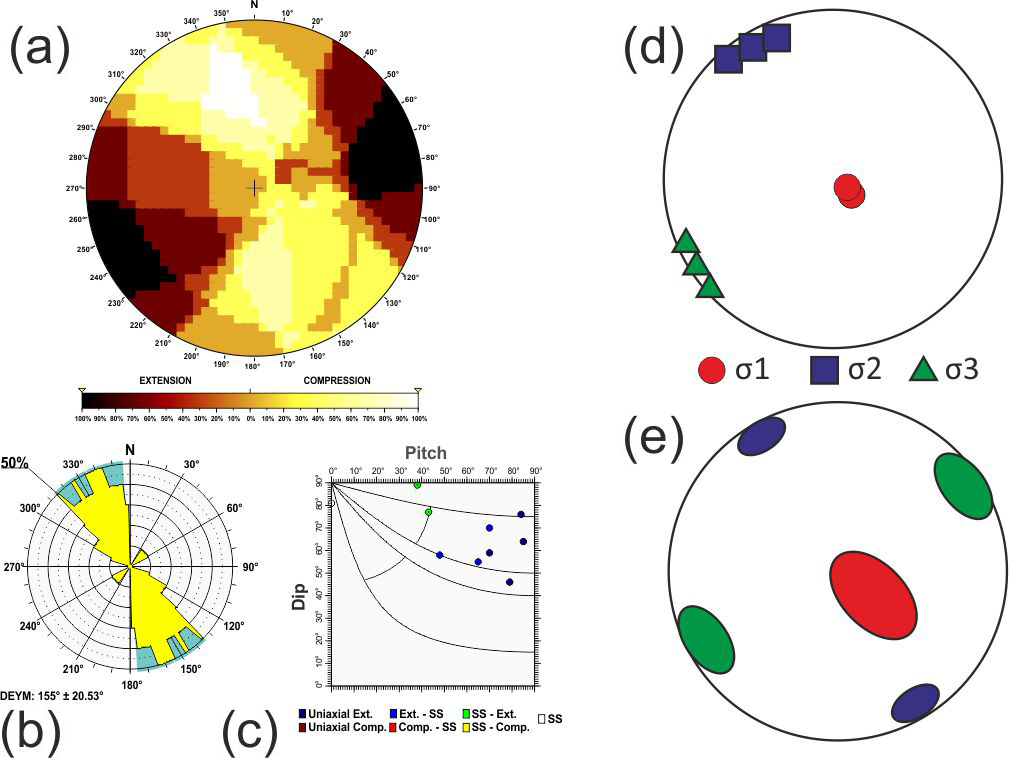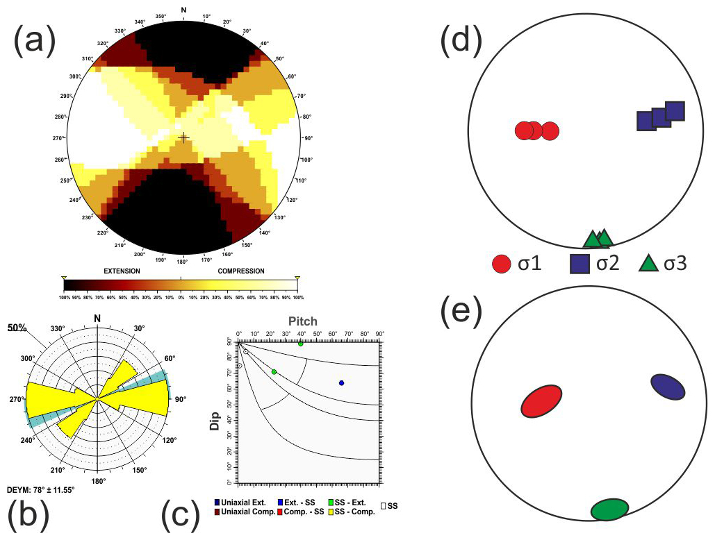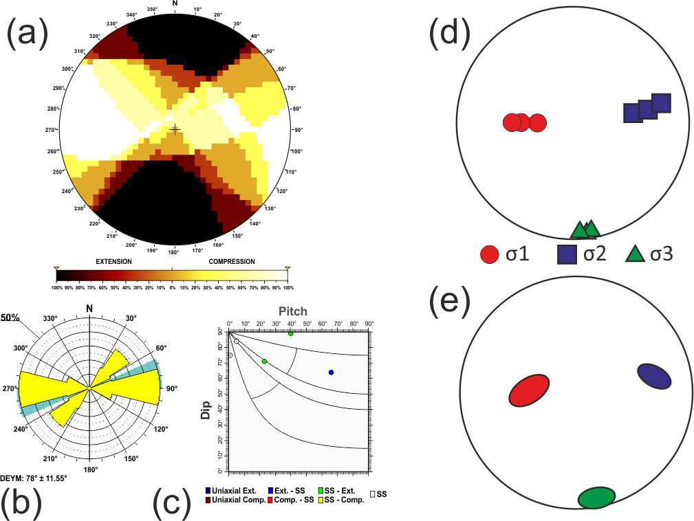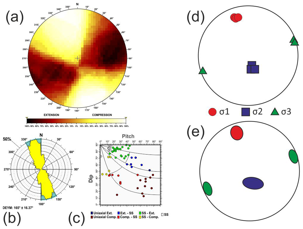 Here σ1, σ2 and σ3 are the largest, intermediate and smallest principal stress axes of the stress tensor. To assess the statistical representativeness of the population of focal mechanisms within each tectonic zone, a Monte Carlo bootstrapping approach was employed to determine the value of the friction coefficient with the fewest errors. This technique enables us to determine the potential variability in the principal stress axes, particularly the possible permutations between two principal stress axes when they have similar magnitudes.