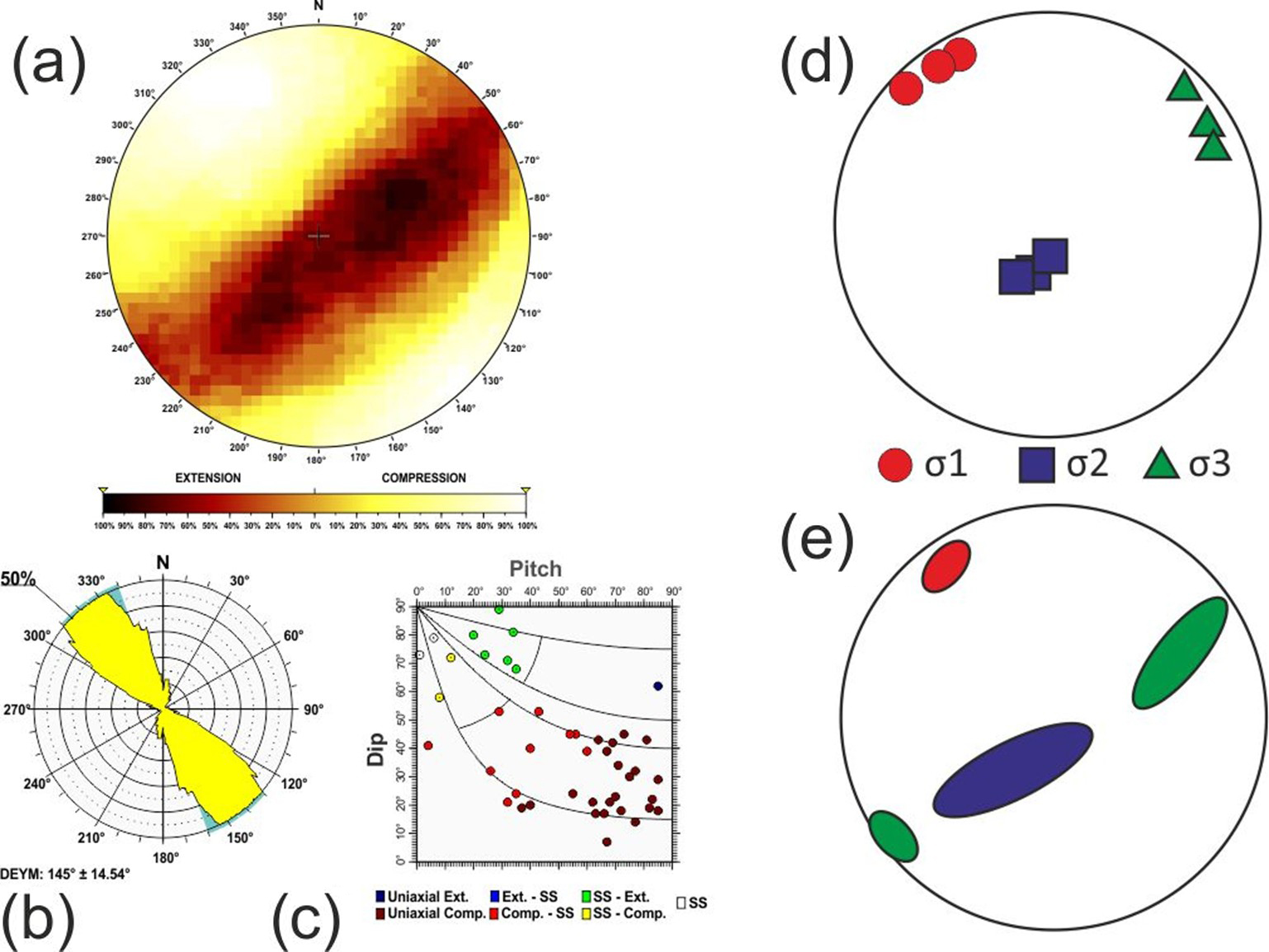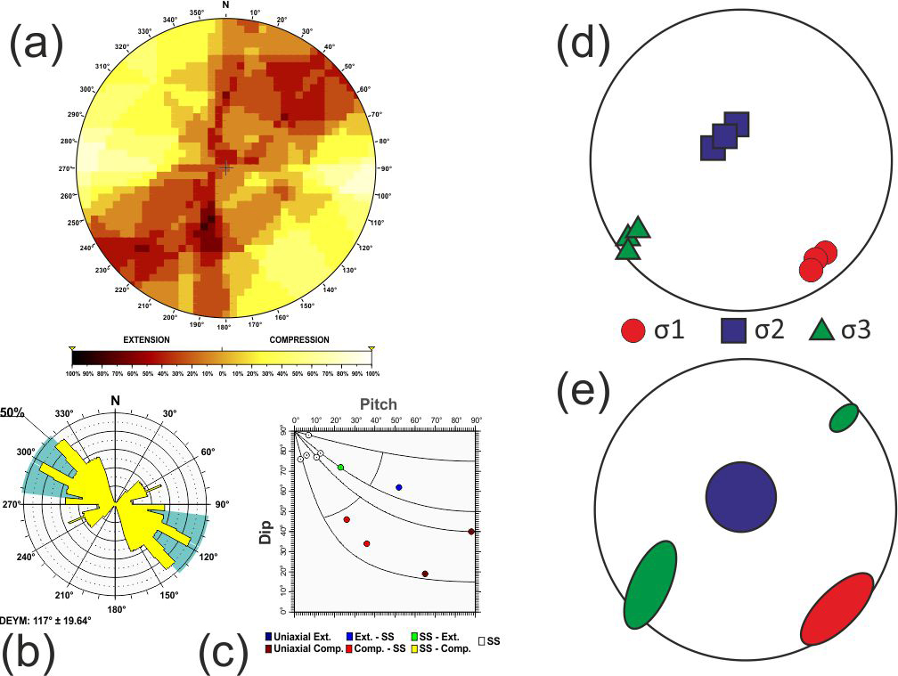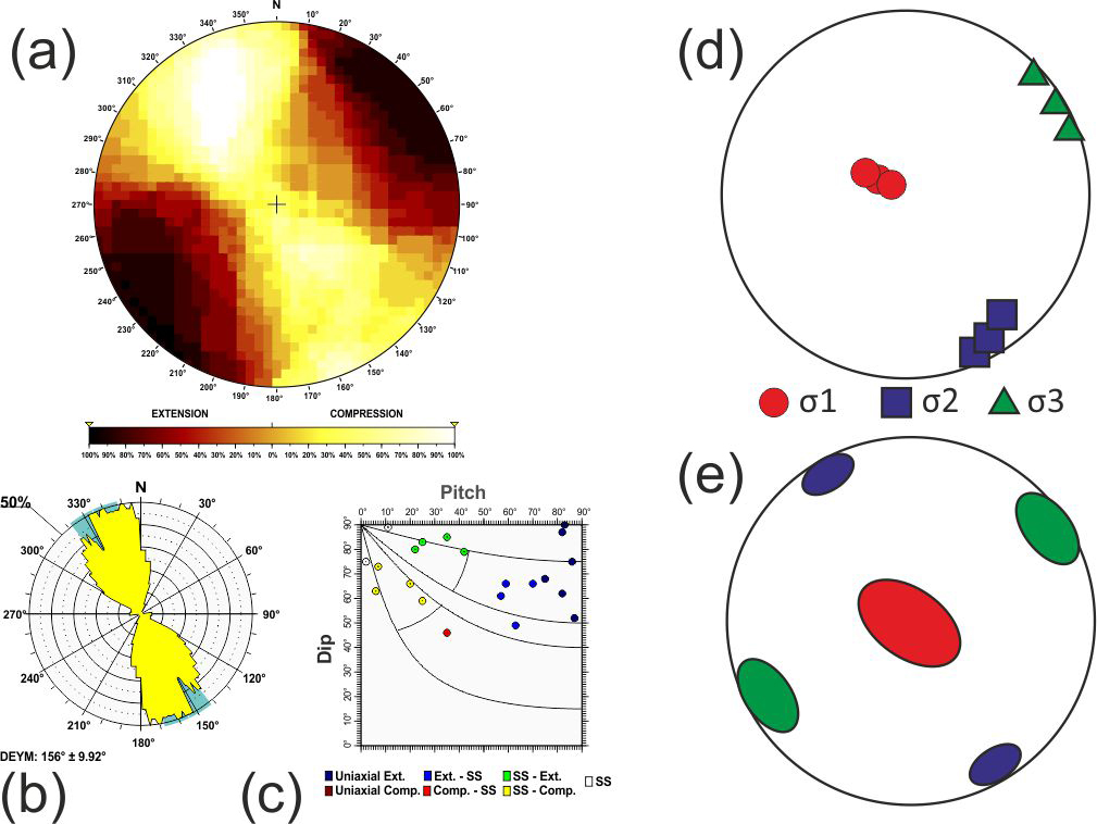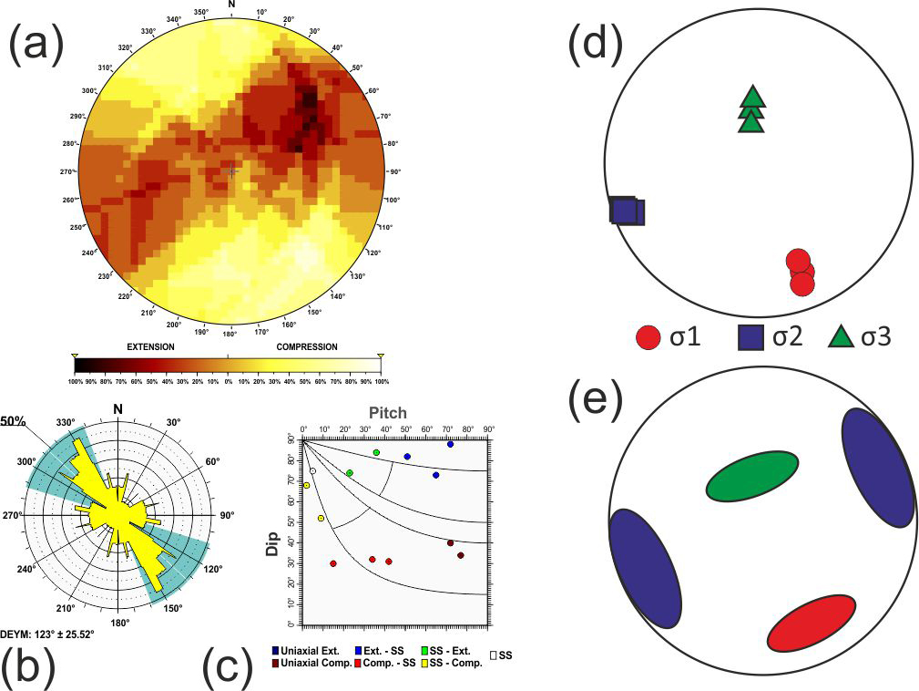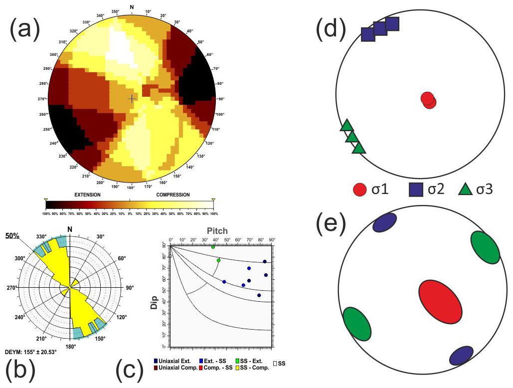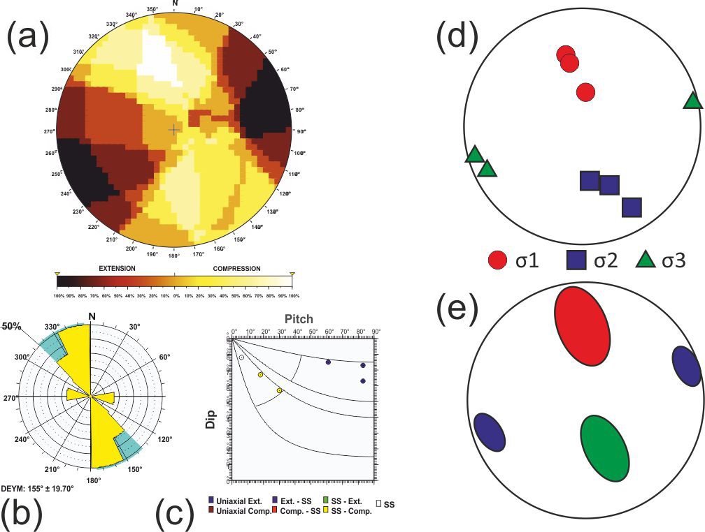 Here σ1, σ2 and σ3 are the largest, intermediate and smallest principal stress axes of the stress tensor. To assess the statistical representativeness of the population of focal mechanisms within each tectonic zone, a Monte Carlo bootstrapping approach was employed to determine the value of the friction coefficient with the fewest errors. This technique enables us to determine the potential variability in the principal stress axes, particularly the possible permutations between two principal stress axes when they have similar magnitudes.
