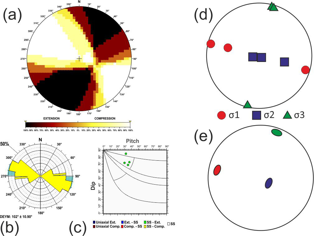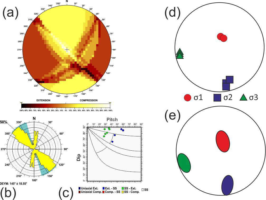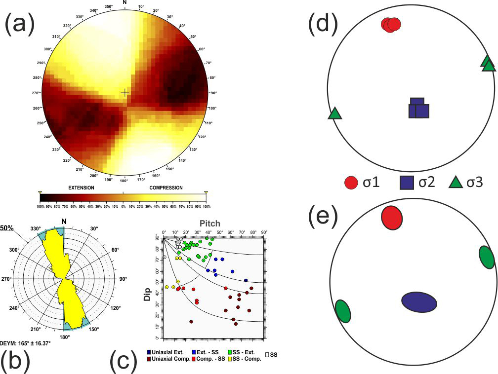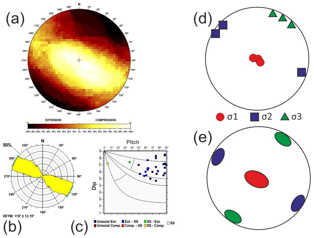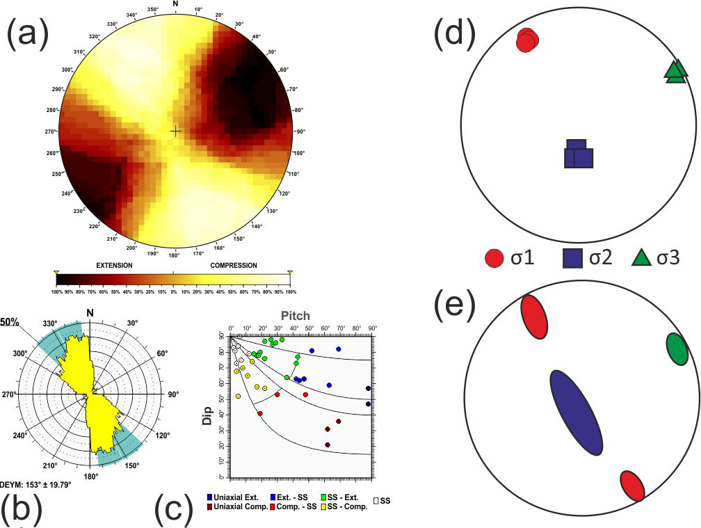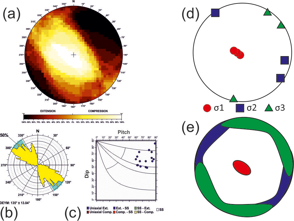 Additionally, based on the relationship between D and P proposed by de Vicente (1988), when the nodal plane coincides with the character of the focal mechanism, frictional energy is dissipated more efficiently. Therefore, the selected plane can be effectively utilised in stress inversion methods that rely on fault plane orientations and their associated slip directions (Angelier and Mechler, 1977). Hence, the quality of the stress inversion results is improved compared to those obtained using both planes (neo-formed and reactivated) (Michael, 1987; de Vicente, 1988; Giner-Robles et al., 2006).