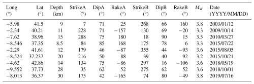 This dataset was expanded through the integration of various regional studies (e.g. Carreño et al., 2008; Chevrot et al., 2011; Domingues et al., 2013; Custodio et al., 2016), datasets associated with projects such as TopoIberia (Martín et al., 2015), and datasets related to earthquake clusters (Morales et al., 2015; Matos et al., 2018). Additionally, it incorporates results from specific seismic crisis events, most likely associated to induced seismicity (e.g. Villaseñor et al., 2020; Cesca et al., 2021). To further enhance the dataset, nine previously unpublished moment tensor focal mechanisms were determined for events that occurred between 2003 and 2019 (Table 1), and focal mechanisms for two historical events were also included in our dataset (Stich et al., 2005). The events are located at depths shallower than the Moho proposed by Diaz et al. (2016), except for some events located in oceanic crust, where the proposed crustal thickness is estimated at approximately 18 km and hypocentral depths are less than 30 km, within a domain in which the rheology of the upper mantle might be assumed to be similar to the crust. In cases where multiple solutions existed for the same event across different catalogues and appearances, the double-couple percentage (%DC) was used as a selection criterion, and the solution with the highest %DC was retained.