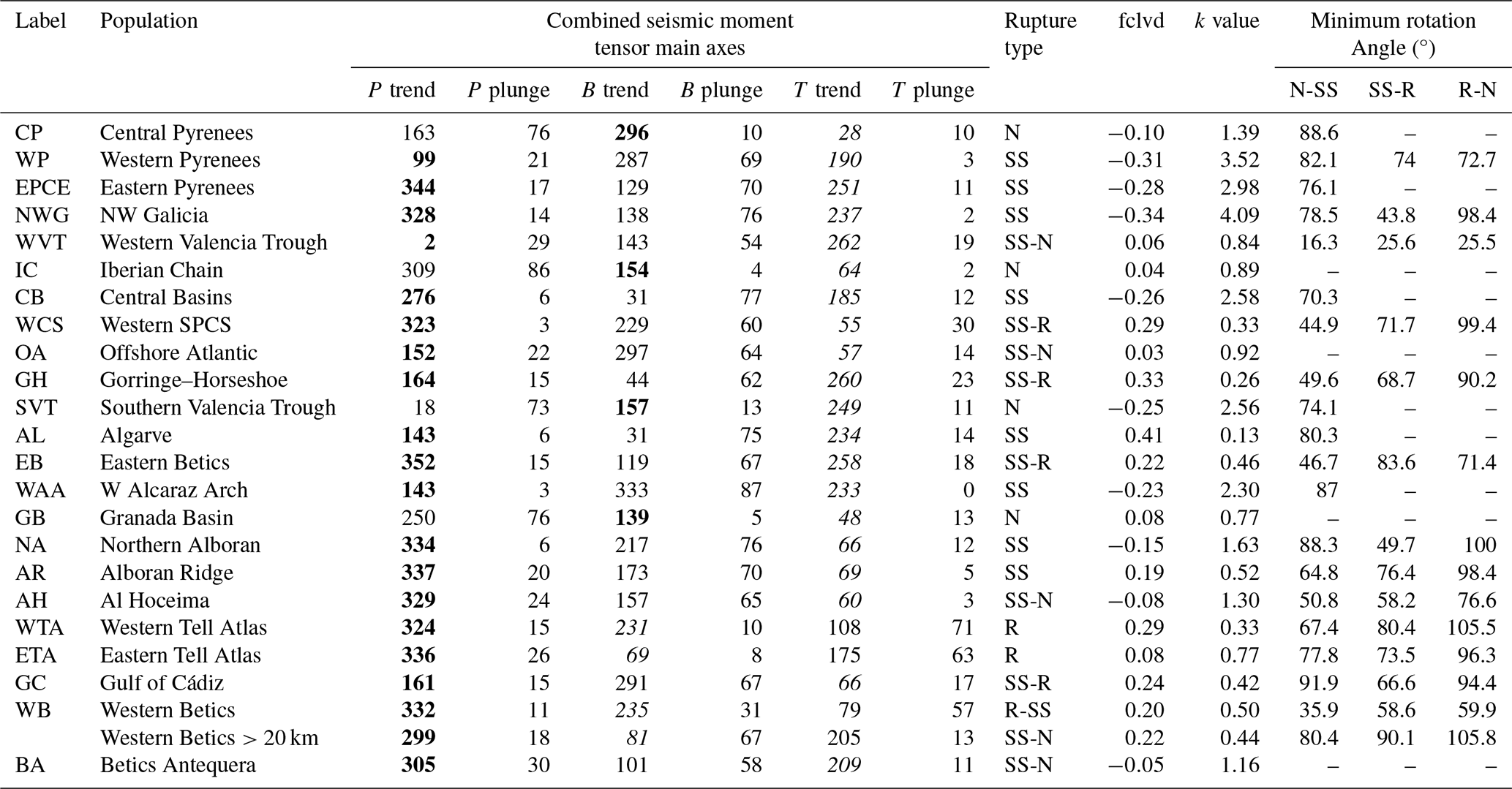 Considering these criteria, we subdivided Iberia into several zones (Fig. 5). In the Pyrenees, we identified three zones: the Central Pyrenees (CP), characterised by mostly normal faulting focal mechanisms, and two additional zones at the eastern and western ends, where there are more focal mechanisms, the Western Pyrenees (WP) and the Eastern Pyrenees–Northern Catalan Coastal Range (EPCE). Further west, on the northern edge, we grouped the earthquakes in Northwestern Galicia (NWG), with numerous focal mechanisms in the central area and offshore. In the east of the peninsula, offshore near the coast, we differentiated two tectonic zones: the Western Valencia Trough (WVT) and the Southern Valencia Trough (SVT). Onshore, we separated the focal mechanisms in the Iberian Chain (IC) and south of the eastern SPCS (Central Basins, CB), along with those in the tectonic zone near Lisbon, which we refer to as the Western Central System (WCS). Further south but not yet at the active plate boundary, we defined the Algarve (AL) as a tectonic zone. In the offshore Atlantic to the west, although the data are very scattered, the focal mechanisms are similar, and several correspond to earthquakes that occurred at mantle depths but are not well constrained. Therefore, we grouped them in the tectonic zone Offshore Atlantic (OA). Further south, primarily offshore and along the plate boundary, we examined the Gorringe–Horseshoe (GH) and Gulf of Cádiz (GC) tectonic zones. The large number and variability of focal mechanisms in the Betics require smaller tectonic zones. Thus, considering the predominance of normal faulting in the Granada Basin (GB), we differentiated the Western Betics (WB) to its west, the Betics Antequera (BA) to its north, and the Western Alcaraz Arch (WAA) and the Eastern Betics (EB) to its east. In the Alboran Sea, we considered the North Alboran (NA), which also has onshore focal mechanisms, and the Alboran Ridge (AR), located at the probable plate boundary. Further south, on the African Plate, in the Rif, we considered the tectonic zones of Al Hoceima (ALH) and Rif (RF). Finally, in the Algerian Atlas, we analysed two populations: one located further east, the Eastern Tell Atlas (ETA), and the other located further west, the Western Tell Atlas (WTA). Figure 5 shows the focal mechanisms in different colours for each area. We utilised the Rif (RF) focal mechanisms in the slip model analysis (Figs. 3 and 4). However, any stress inversion yielded a high-quality solution; therefore, we will not comment on RF active tectonics (Fig. 5).
