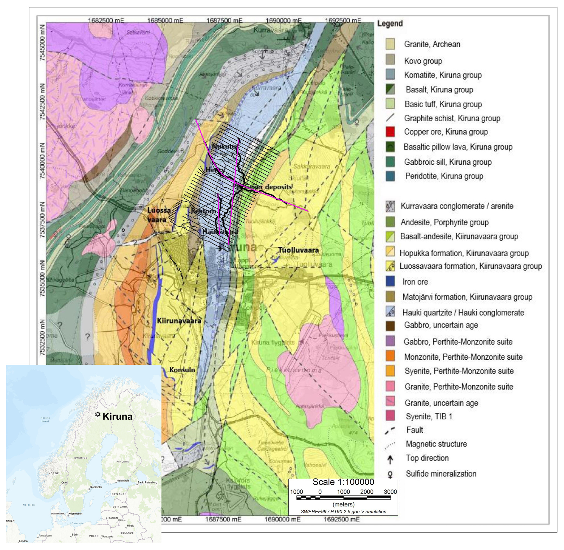 Figure 1Geology of the Kiruna area, with location of the seismic surveys. The seismic receiver points are shown in black, and the CDP projection lines for the 2D profiles in purple. The source points have been omitted. Geological map modified from Martinsson and Erlandsson (2009).