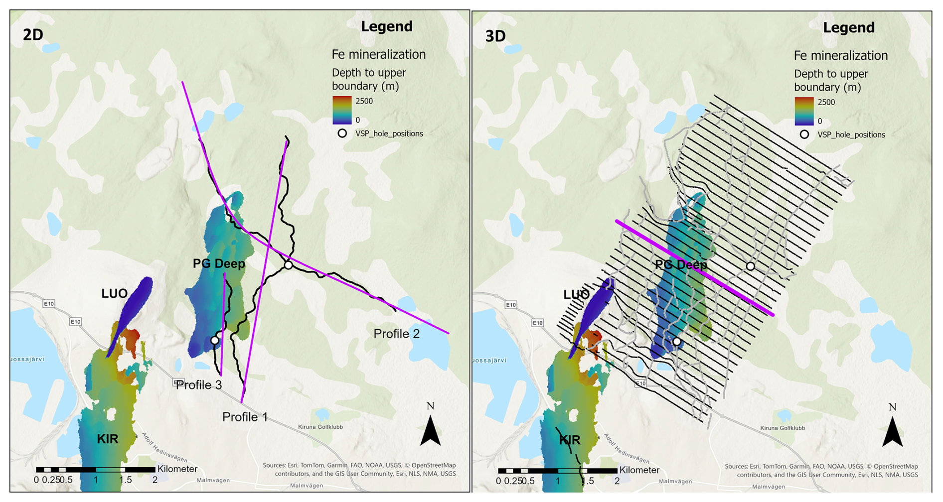 Figure 2The seismic surveys in comparison with the iron-oxide deposits in the Kiruna area, colored by the depth to the upper boundary: KIR – Kiirunavaara, LUO – Luossavaara, PG Deep – Per Geijer Deep. Black symbols show receivers and grey symbols source points. For the 2D surveys, the source points overlap with the receivers. The purple symbols show CDP projection lines and the inline selected for display in Fig. 8. The two VSP holes are also shown. Background map credits: Esri, TomTom, Garmin, FAO, NOAA, USGS, NLS, NMA.
