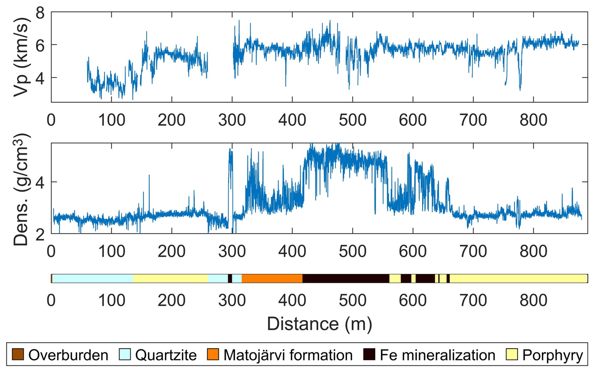 Figure 3Wireline logs from one drill hole intersecting the Per Geijer Deep iron mineralization. The lithology description has been simplified.