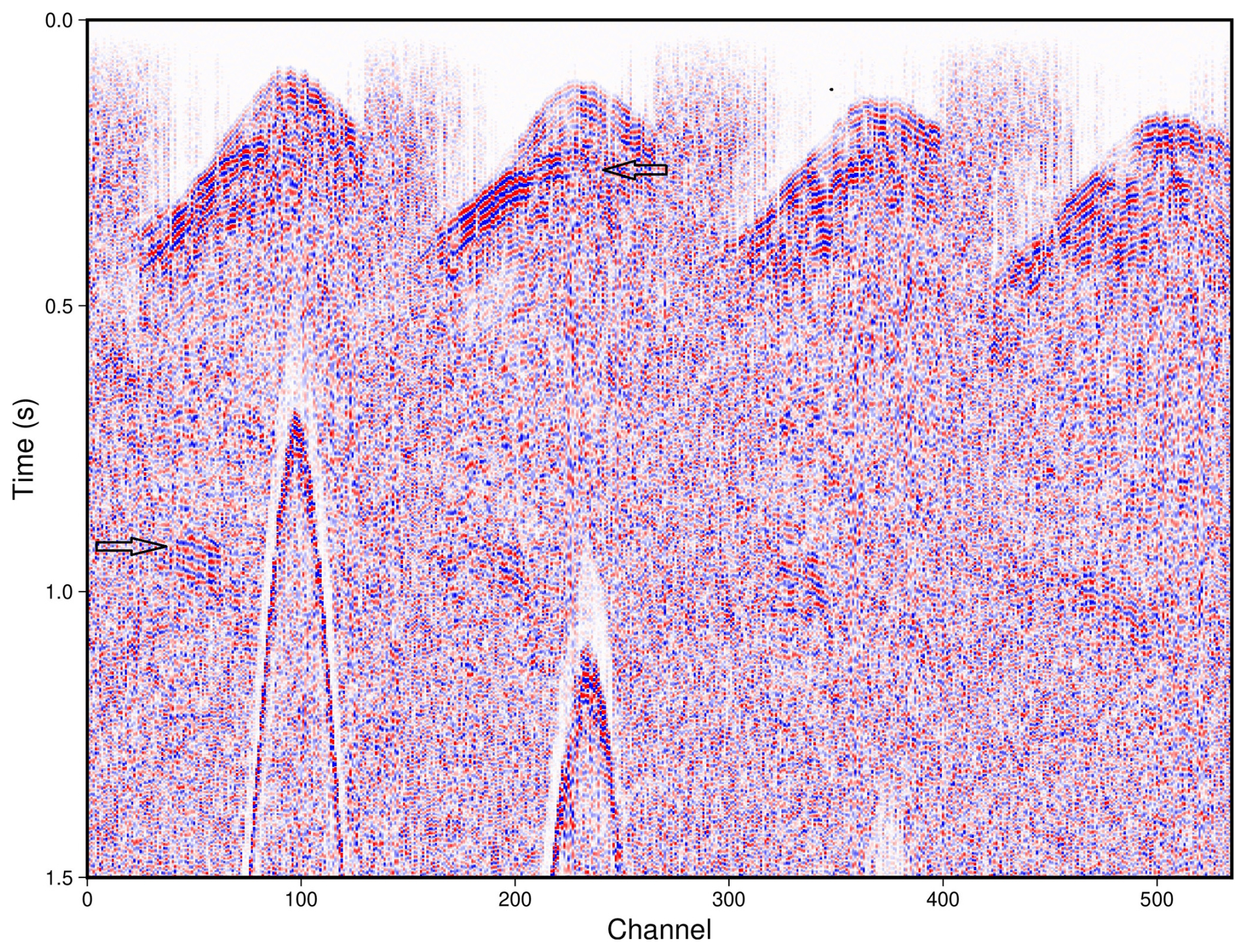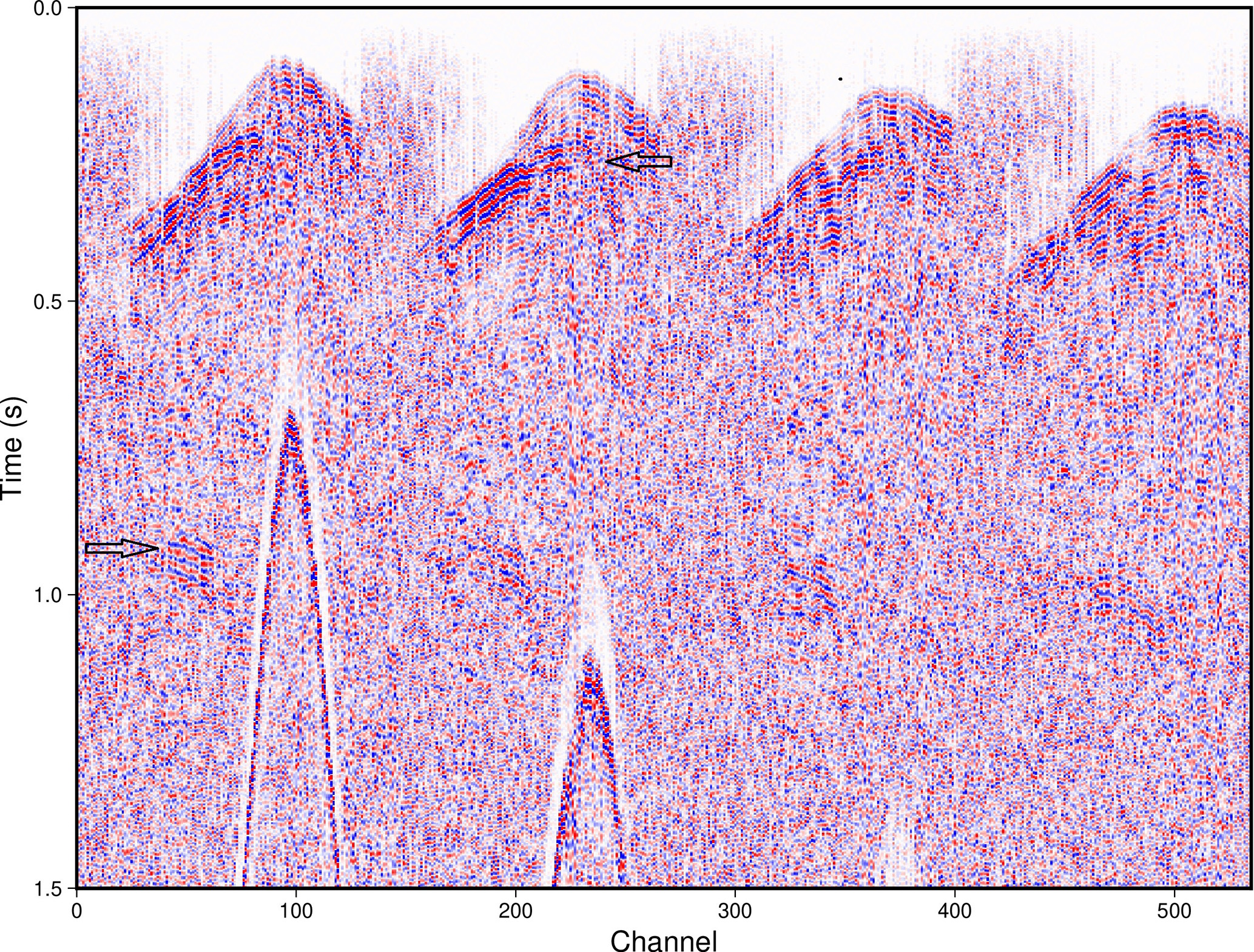 Figure 4Example shot record data, from the 3D survey. The image only shows a subset of channels. Automatic gain control and frequency filtering has been applied prior to plotting. Arrows mark the reflections discussed in the text.