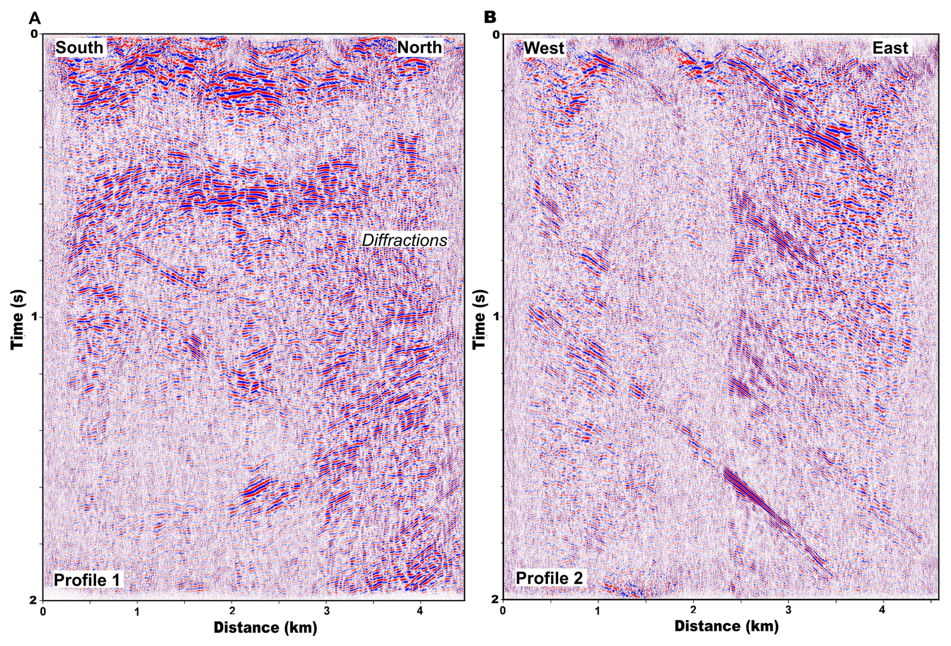 Figure 5(A) Stacked time section from Profile 1. (B) Stacked time section from Profile 2. The change in reflection character at about 2.4 km along Profile 2 is caused by a change in the stacking fold.