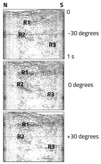 Figure 6Cross-dip analysis for Profile 3. The data have been stacked assuming different cross-dip angles of the reflections, i.e. dip perpendicular to the profile direction, which is approximately north-south. The cross-dip is measured relative to horizontal and defined as positive for reflections dipping to the east. Reflection R2 has the highest amplitude for zero cross-dip, whereas R1 and R3 has highest amplitude for 30° cross-dip towards east.