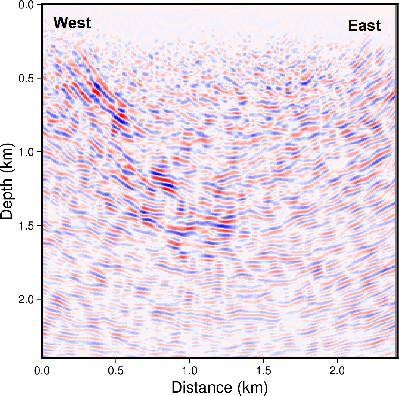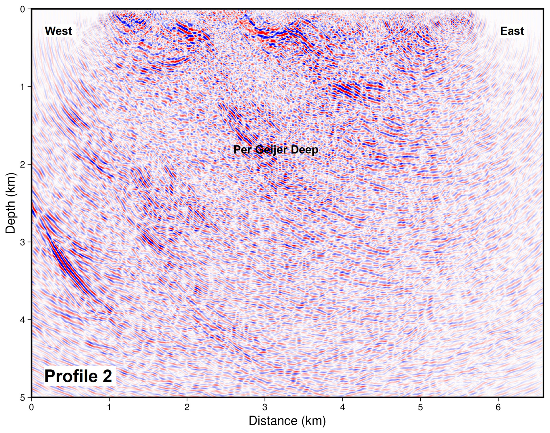Figure 7Depth section from Profile 2, post-stack migrated. The profile has been padded by 1 km at both ends.