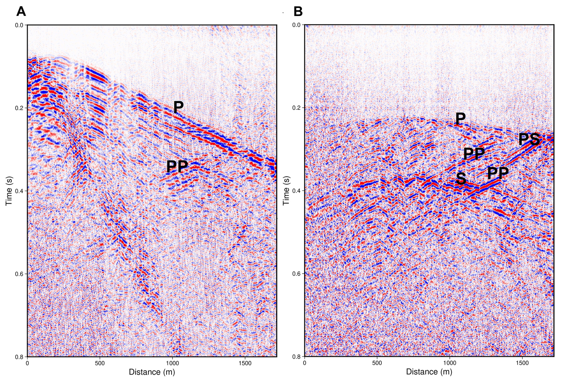Upgoing waves interpreted to be P-wave reflections (PP) can also be observed, originating from about 1500 m depth along the drill hole. For comparison, the geological logging shows that iron mineralization is mainly occurring within the intervals 1450–1550 and 1650–1700 m. There are signs of P-S converted reflections in some records, more clearly seen for source points at some distance from the drill hole (Fig. 9B).