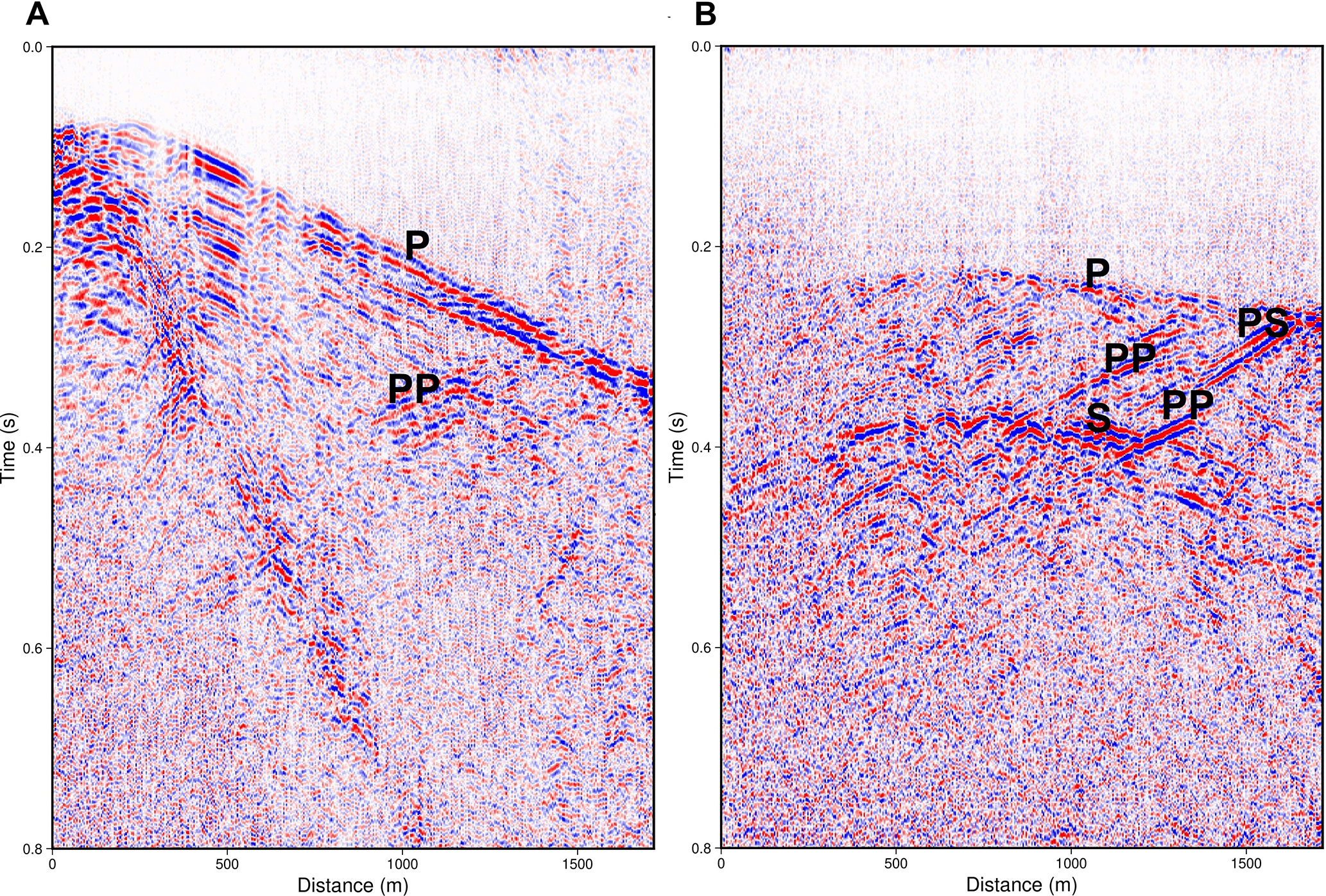 Figure 9Seismic records from the walkaway VSP survey, with increasing depth towards right (the x-axis shows distance as measured along the drill hole). (A) Record for a source point close to the drill hole. In this case the down going P-wave has a roughly linear appearance. (B) Record for a source at some distance from the drill hole, in which the down going P-wave shows curvature. For clarity, the tube waves have been suppressed prior to display. Spectral balancing and AGC have also been applied. See text for description of the annotated seismic phases.