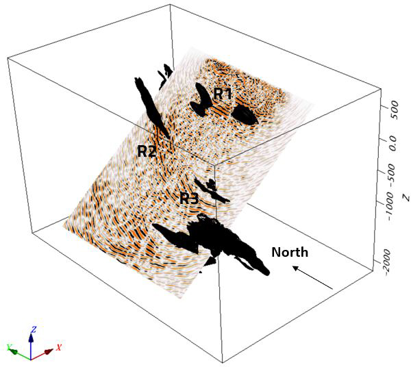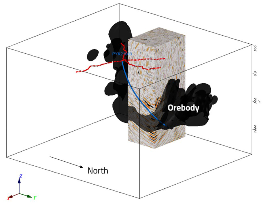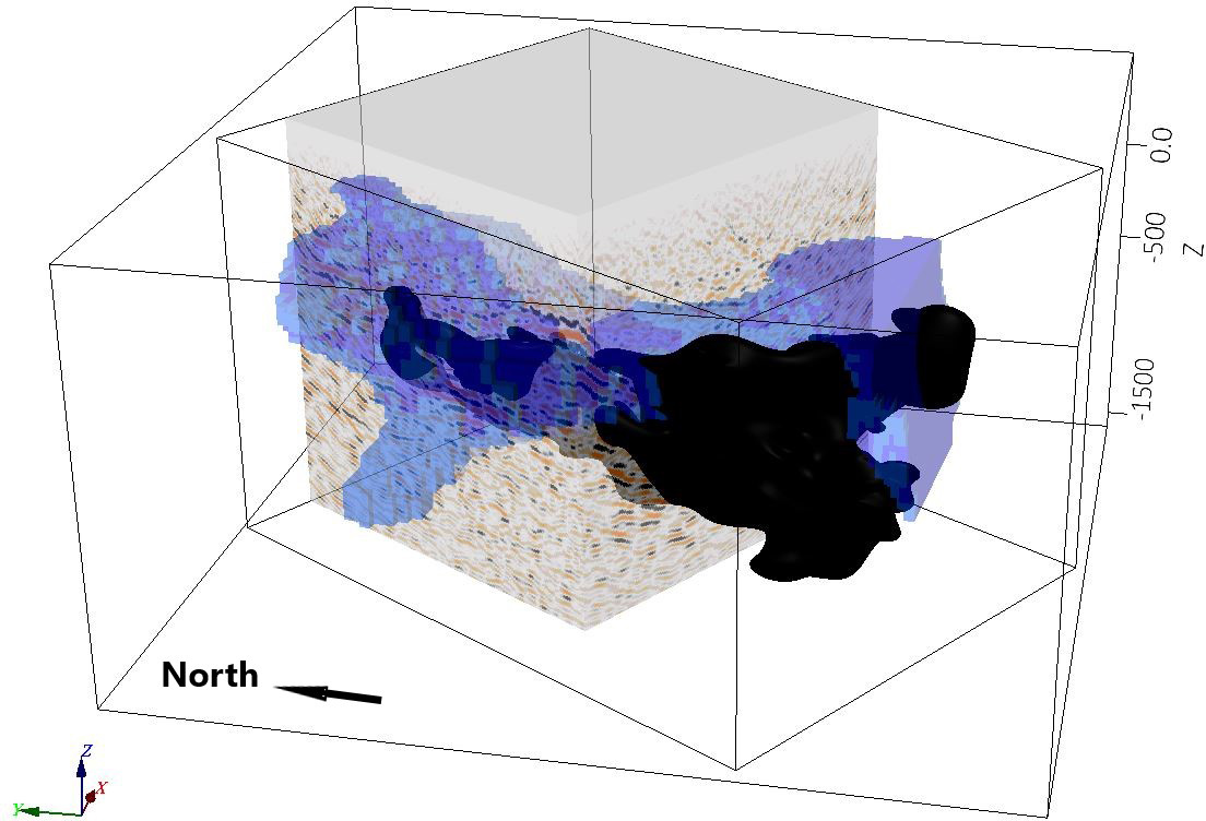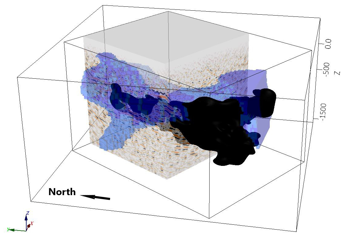 Figure 11Pre-stack migrated depth volume from the 3D survey, in comparison with the geological model for the Per Geijer Deep mineralization, shown in black. Also shown in blue is the electrical conductivity model from a semi-airborne EM survey (Smirnova et al., 2020). All cells with conductivity >0.02 S m−1 are shown. The seismic volume and the conductivity model are semi-transparent.