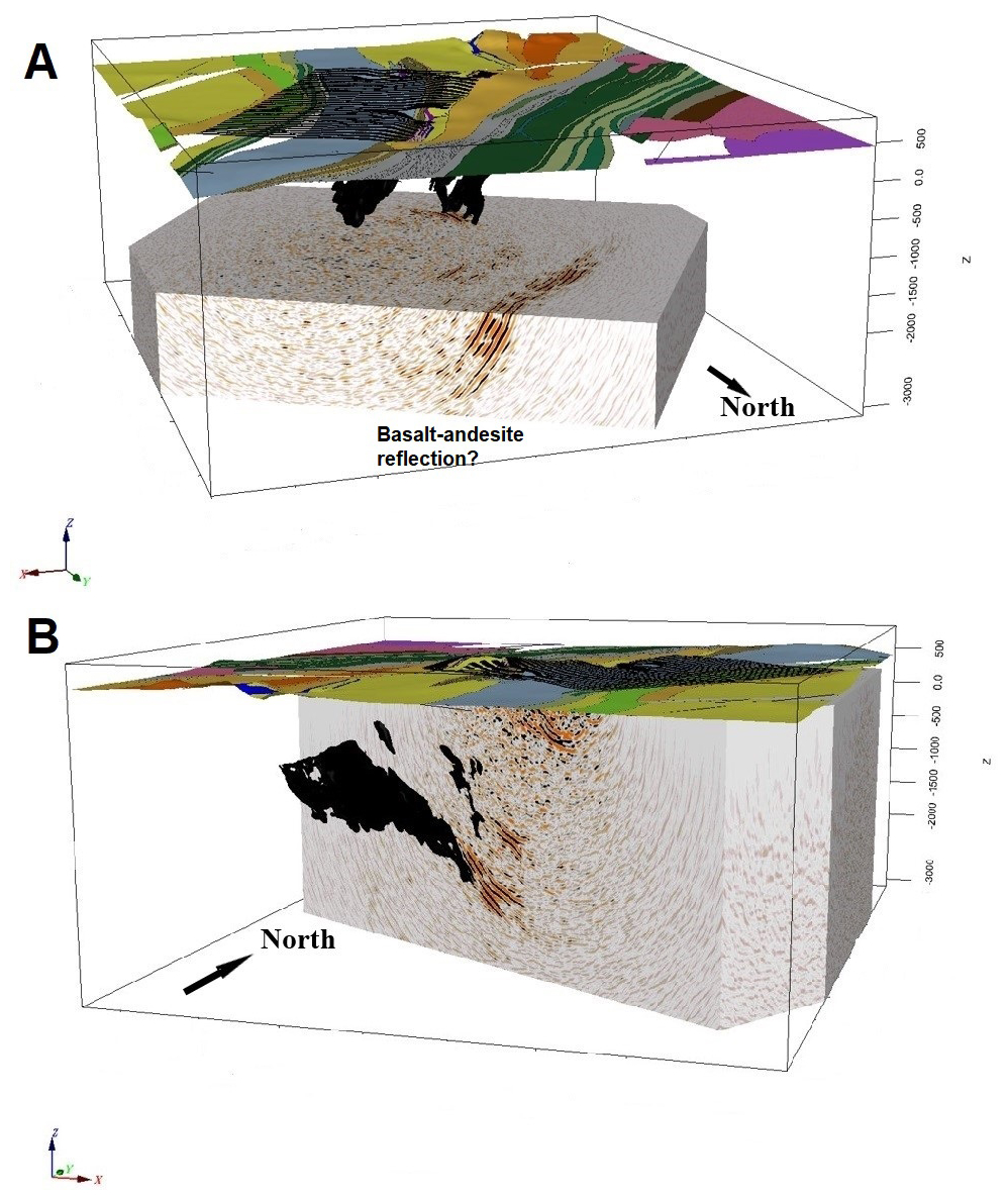 A comparison between the pre-stack migrated 3D seismic image and the deposit model for Per Geijer Deep shows a clear correlation between the most distinct reflections and the iron-oxide volume (Fig. 11). This is observed in all the seismic data from the Per Geijer area, and particularly evident in the migrated image from the walkaway-VSP survey (Fig. 10). Although it is often difficult to tie the reflections directly to the contacts of the iron mineralization, it seems likely that these iron-oxide deposits are causing much of the associated seismic reflectivity.