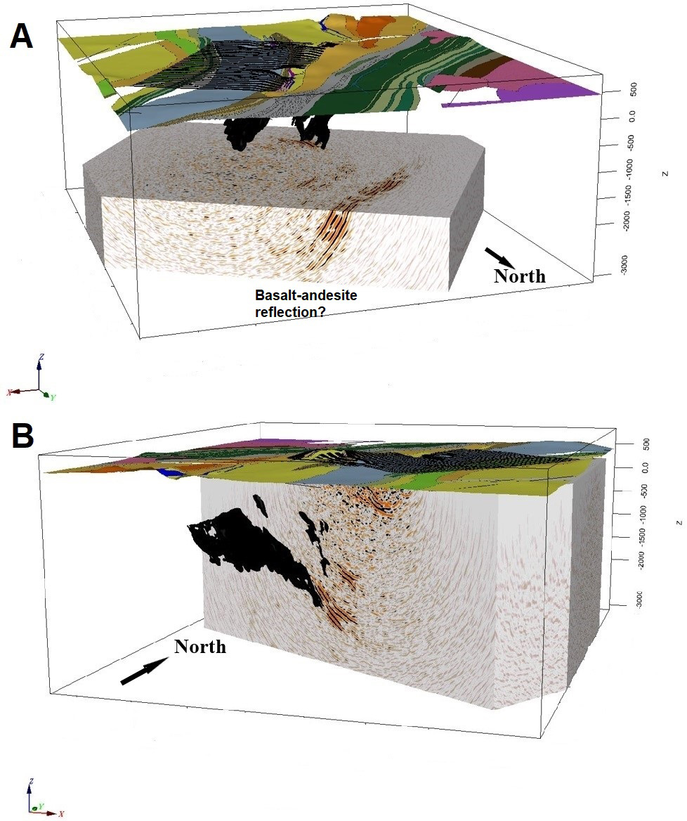 There are also at least two reflections to the west of the actual survey area, beyond the reach of any drill holes (Fig. 13A). The most pronounced one is clearly seen in Profile 2 (Fig. 7), and it was a dominating feature in the small 3D survey mentioned earlier. A possible explanation could be the 2.40–1.96 Ga basalt-andesite units to the west of the survey area, judging by where the reflection projects to the surface. Ground and airborne EM measurements show a pronounced electrical conductor roughly correlating with the basalt-andesite units (Smirnova et al., 2020), possibly partly caused by graphite. Sparsely located dynamite shots during an earlier reflection seismic profile in this area also indicated a pronounced east-dipping reflection, possibly extending to depths of 10 km or more (Juhojuntti et al., 2014).