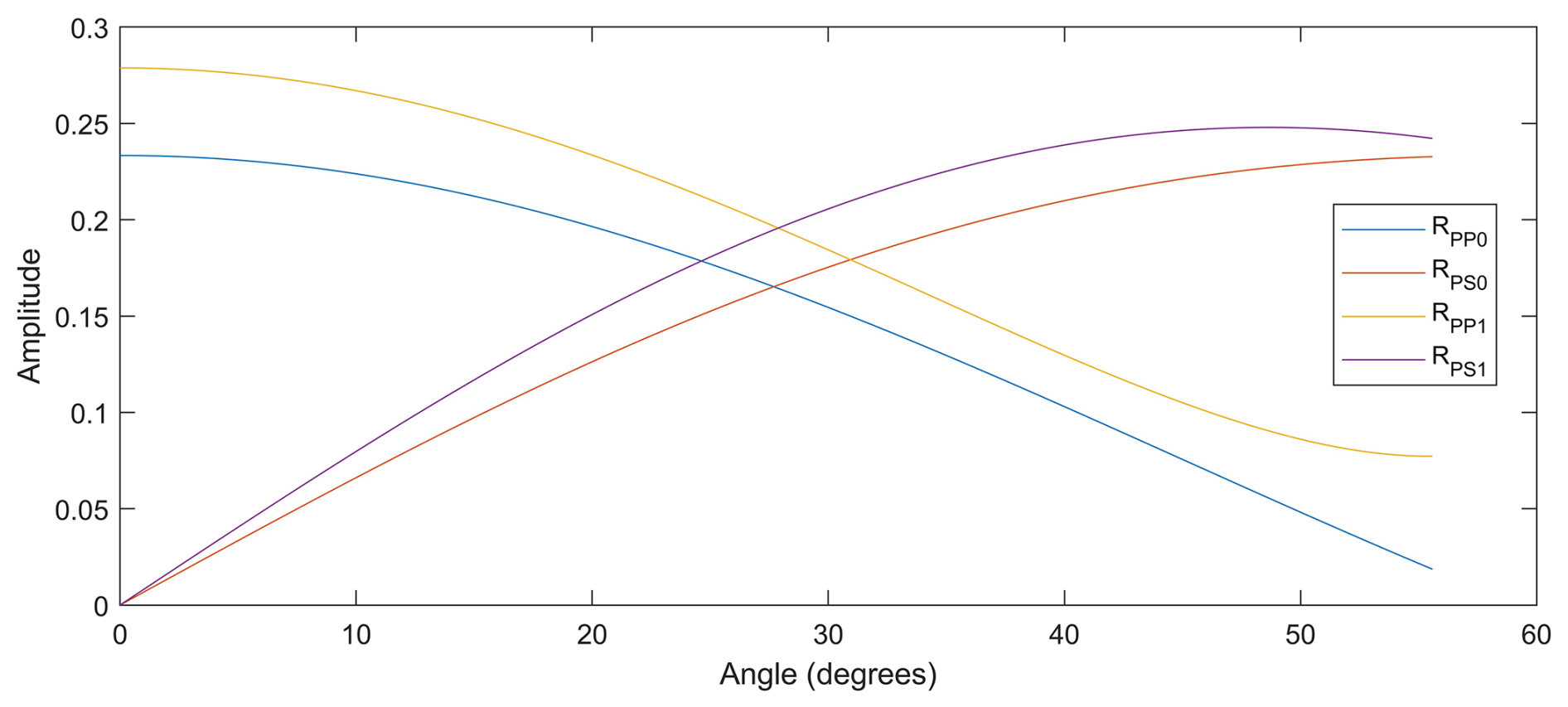 Figure 14Calculated approximate reflection coefficients for the Per Geijer Deep mineralization. The angle is measured relative to vertical, with 0° referring to normal incidence. RPP0 and RPS0 represent the case of no velocity contrast, whereas RPP1 and RPS1 represent a P-wave velocity increase from 5.5 to 6.0 km s−1, and S-wave velocities defined through a VP/VS ratio of 1.72. For both cases, the density increases from 3.0 to 4.4 g cm−3 at the contact.
