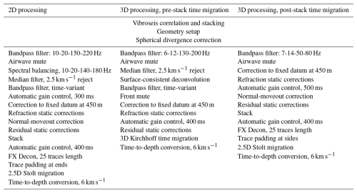 We have relied on conventional algorithms for the data processing, and the processing steps are summarized in Table A1 in the Appendix. Similar pre-stack processing sequences have been applied for all the 2D profiles, followed by post-stack migration and depth-conversion to generate the seismic images. For the 3D dataset, two different processing approaches were used, one based on pre-stack time migration and filters with wider bandwidth, the other based on post-stack migration and lower frequencies. The first approach was focused on imaging the main target of the survey, the Per Geijer Deep mineralization, with as high resolution as possible. The second 3D processing approach was aimed at imaging deeper targets using lower resolution, using a more simplified processing flow less likely to generate artefacts. CPU limitations put constraints on the maximum size of the image volumes for the pre-stack migration.