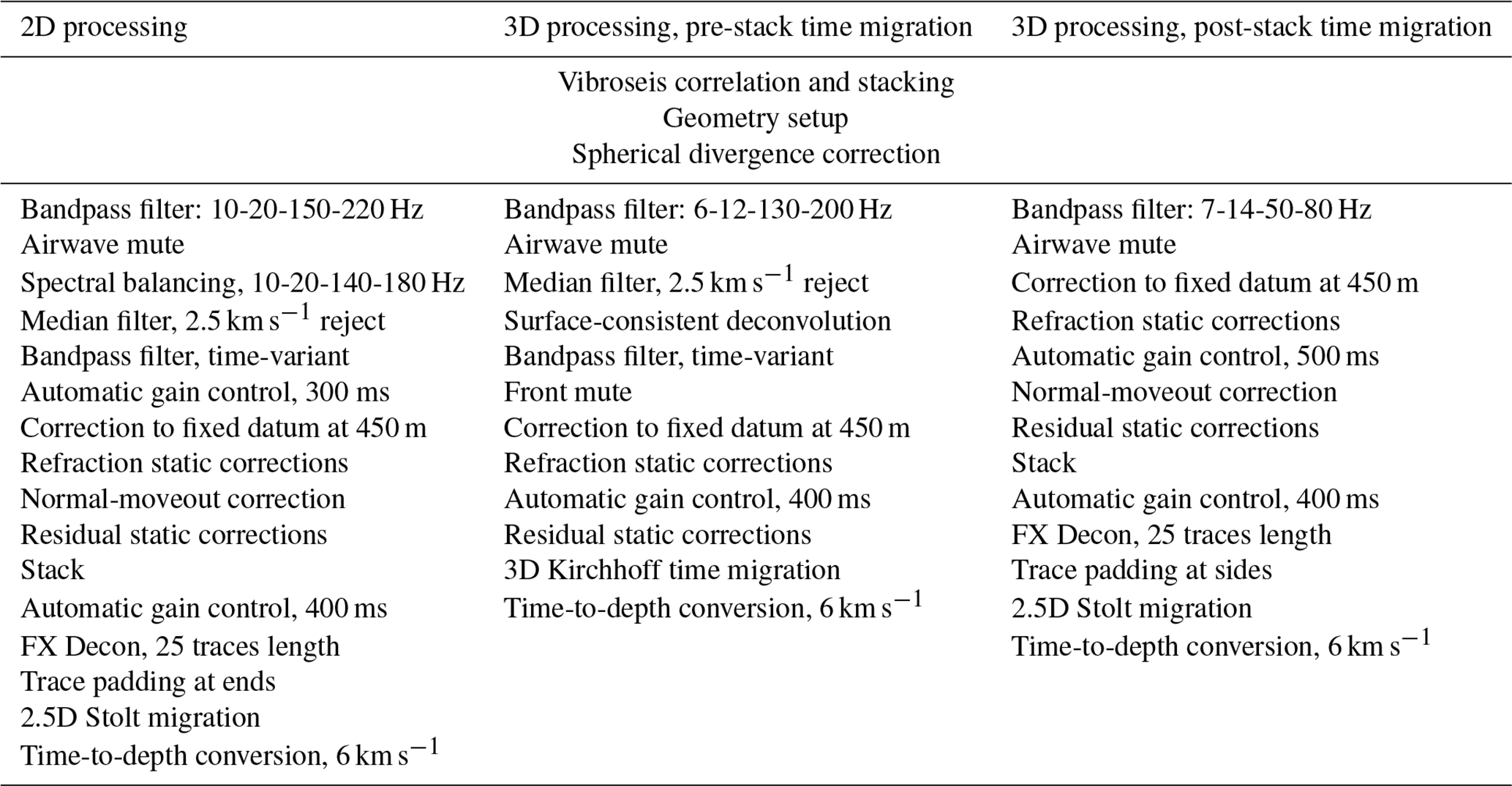 Surface-consistent deconvolution (Cary and Lorentz, 1993) was used for the 3D data prior to pre-stack time migration, mostly to improve waveform consistency, although it will also compress the waveform to some degree. For the 2D profiles, spectral equalization was used instead. These spectral adjustments were followed by time-varying bandpass filters, with gradually decreasing filter frequencies towards later times to account for the loss of high frequencies due to attenuation. For the second 3D processing approach which included post-stack migration and was aimed at deeper structures, no spectral adjustments or time-varying filters were used.