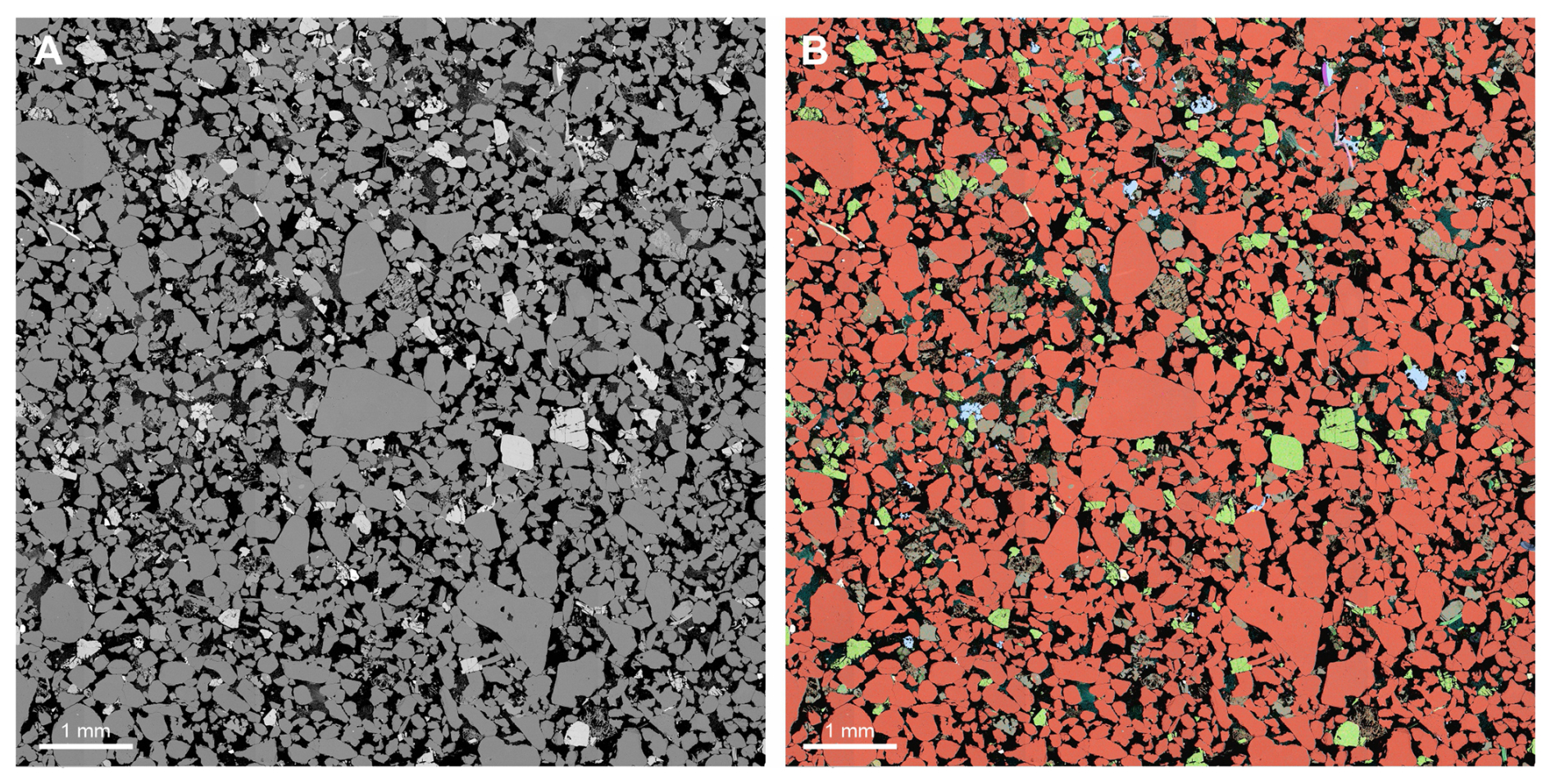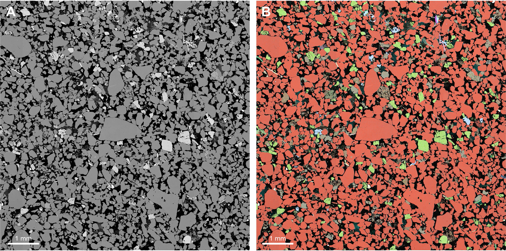 Figure 1Back scattered Electron and semi-transparent EDS elemental maps of pre-experiment D sand, Captain Sandstone (a and b, respectively). Black = pore/void space, red/orange = quartz, green/yellow = orthoclase, grey/brown = oligoclase, pale blue = calcite