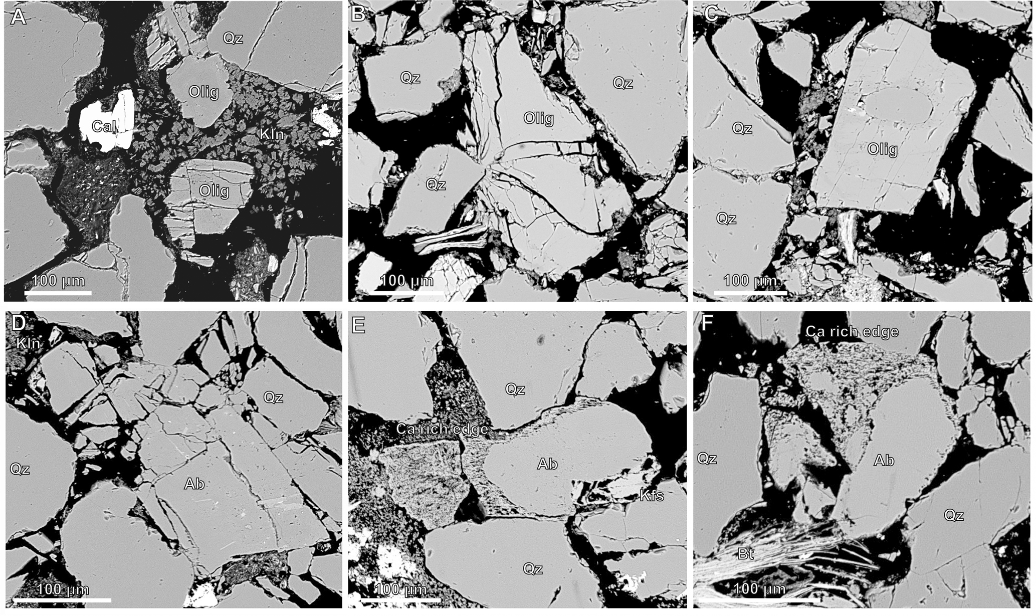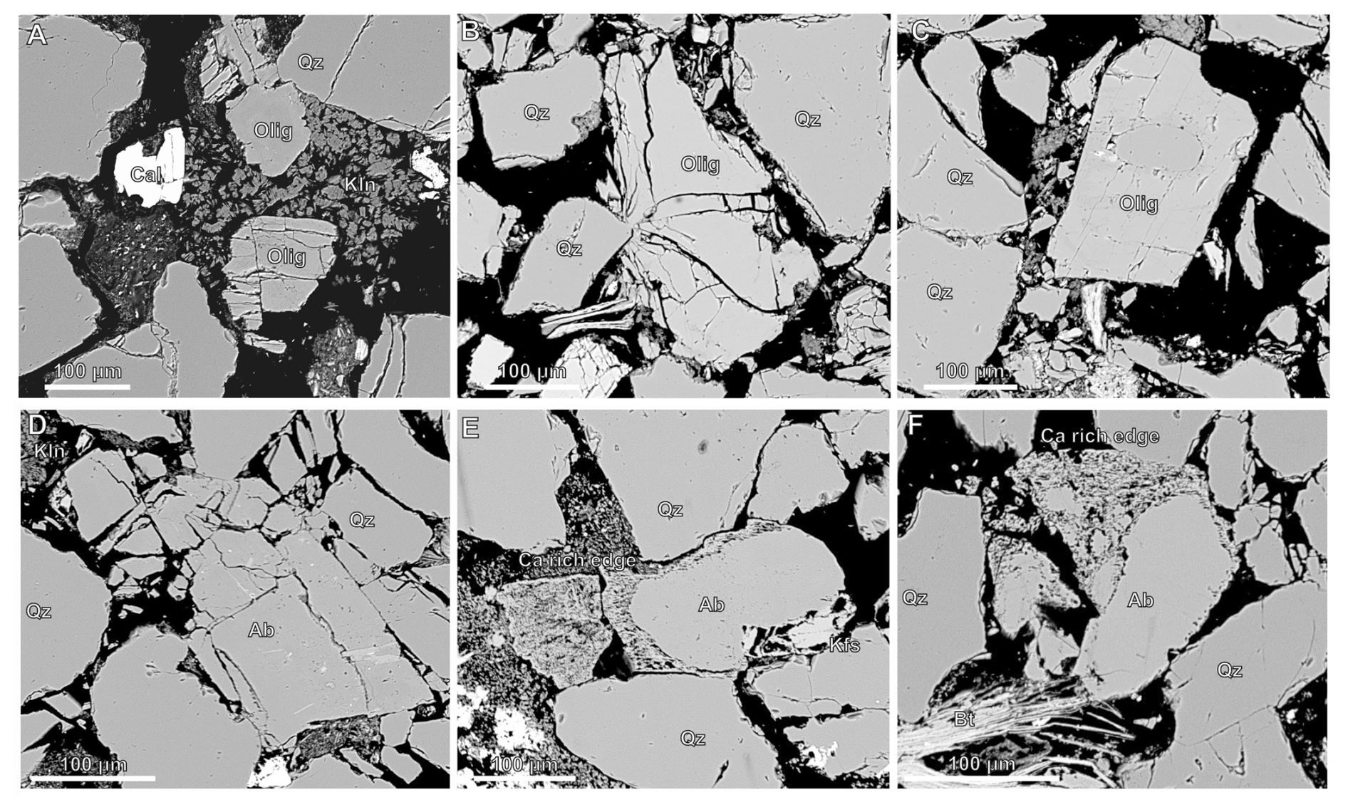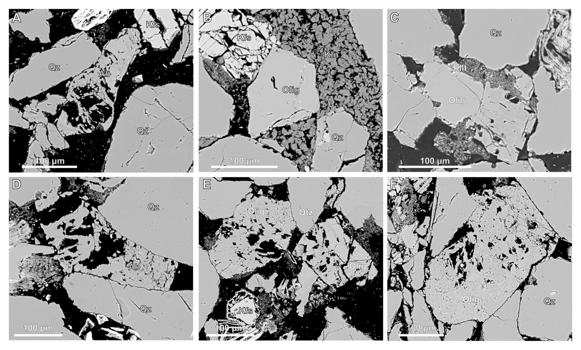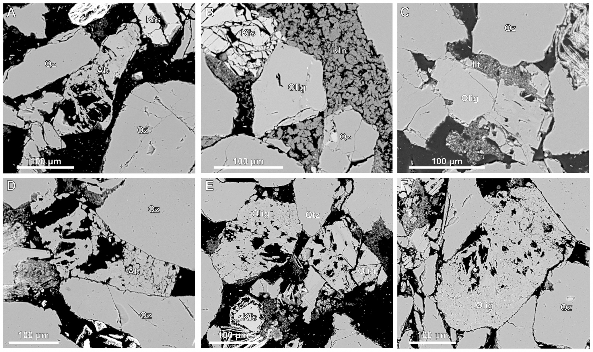 Figure 2Back Scattered Electron images showing feldspar types including plagioclases, oligoclase (A, C) and albite (B, C) and K- feldspar (D–F) in pre-experiment samples of Captain Sandstone. Abbreviations follow Whitney and Evans, 2010. Quartz (Qz), (Oligoclase (Olig), K-feldspar (Kfs), Albite (Ab), Kaolinite (Kln).