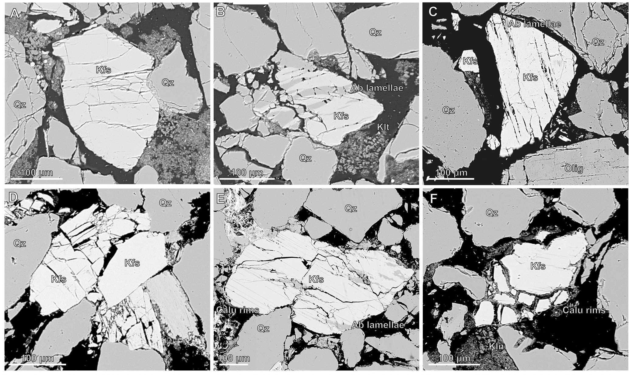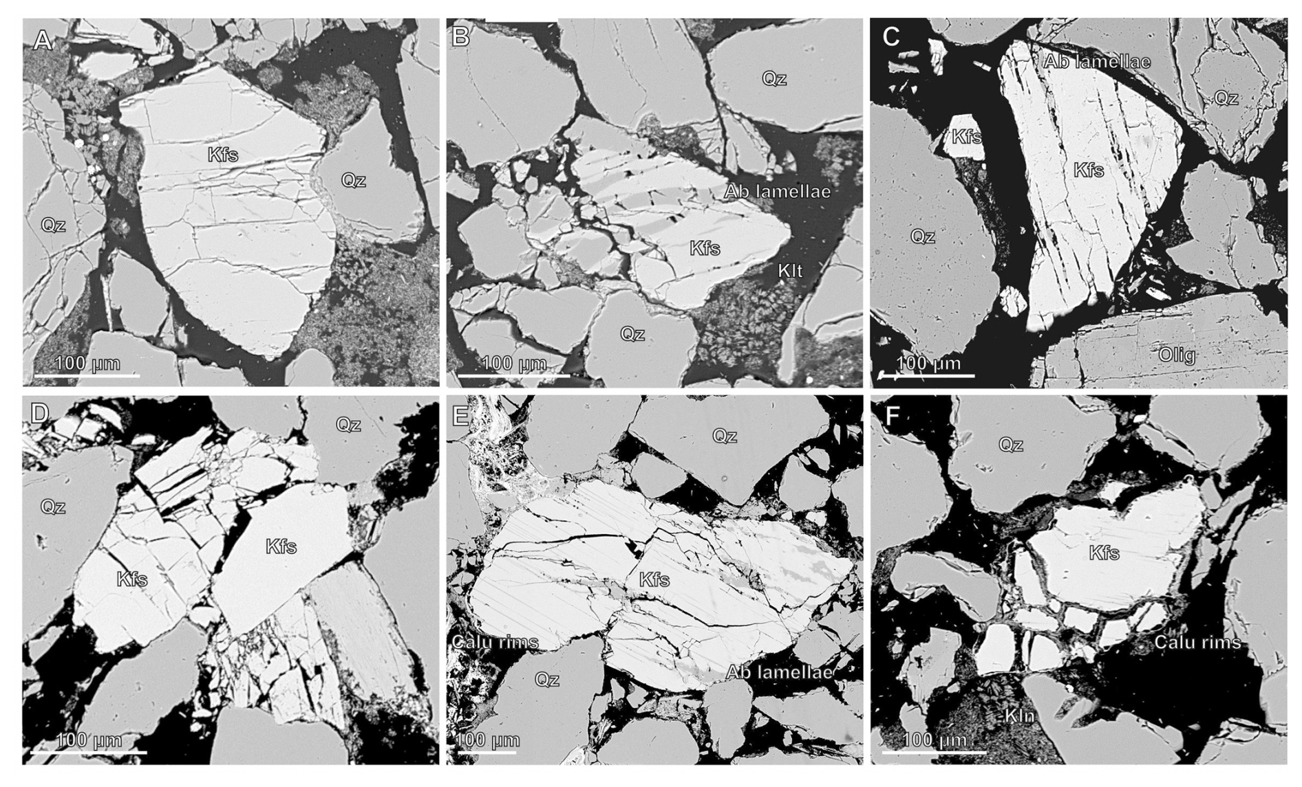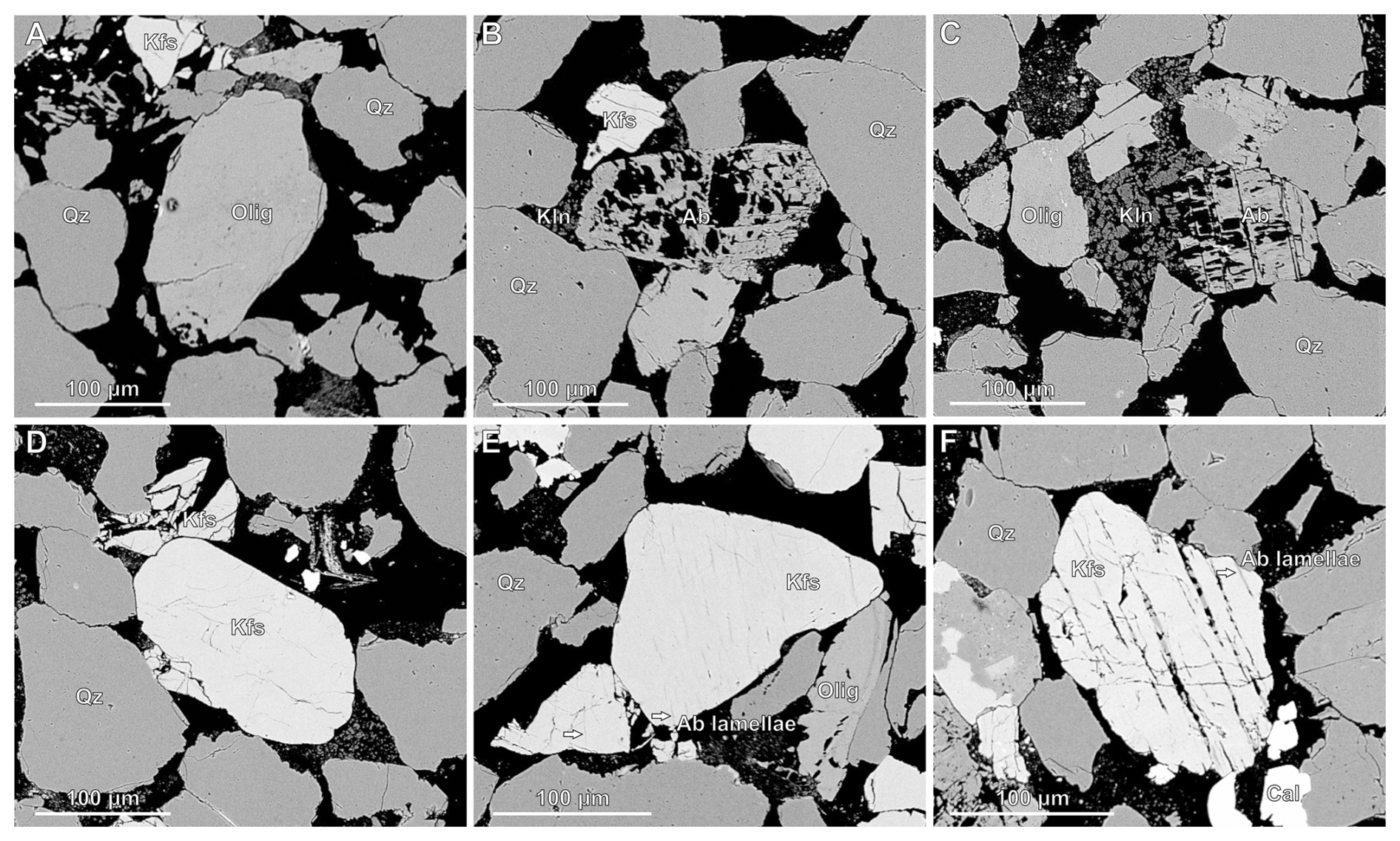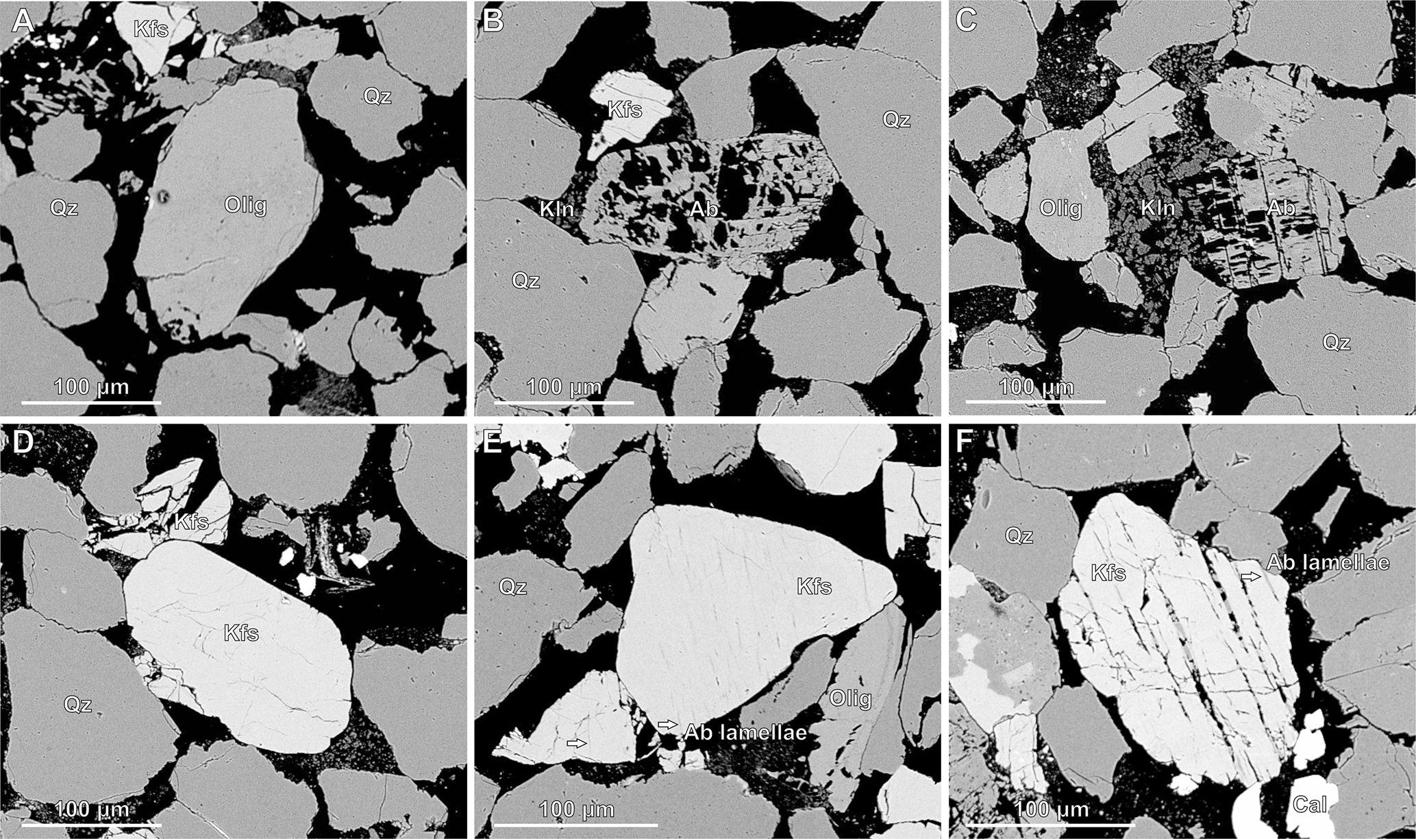 Figure 2Back Scattered Electron images showing feldspar types including plagioclases, oligoclase (A, C) and albite (B, C) and K- feldspar (D–F) in pre-experiment samples of Captain Sandstone. Abbreviations follow Whitney and Evans, 2010. Quartz (Qz), (Oligoclase (Olig), K-feldspar (Kfs), Albite (Ab), Kaolinite (Kln).