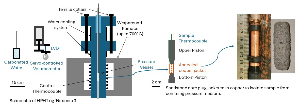Carbon Capture and Storage (CCS) projects aim to moderate the impacts of climate changes by injecting supercritical CO2 into porous rock, such as deep saline aquifers and depleted hydrocarbon sandstone reservoirs, where it is intended to be stored for 10 000 years/indefinitely (IPCC, 2005). The productivity and safety of CCS projects hinge on our ability to efficiently flow CO2 fluids into subsurface rock formations while preventing leakage. A key challenge for success is the ability to predict dynamically changing fluid-flow during injection and CO2 plume migration (Juanes et al., 2006; Benson and Cole, 2008; Ringrose, 2020; Akhurst et al., 2025). This requires both a specific knowledge of the pre-injection micro-scale reservoir properties, e.g., pore volume, pore connectivity, grain texture, and a broader empirical understanding of how injected fluids might mechanically and/or chemically alter this microstructure and thereby impact CCS project efficiency and safety (Rochelle et al., 2004; Hall et al., 2015; Rathnaweera et al., 2015; Shogenov et al., 2015; Fuchs et al., 2019; Foroutan et al., 2021; Pessu et al., 2025). Experimental studies have explored these CO2-fluid-sandstone interactions showing that the acidic brines created by dissolution of CO2 into formation fluids enhances dissolution of carbonate minerals, primarily as cements in sandstone reservoirs (Ross et al., 1982; Bertier et al., 2006; Hangx et al., 2015) with fewer studies reporting CO2 fluid alteration of reactive aluminosilicates, including feldspars (Bertier et al., 2006; Hall et al., 2015; Lu et al., 2013). Geochemical models indicate that feldspar alteration may result in precipitation of carbonate minerals e.g., dolomite and dawsonite, which could permanently “lock-in” CO2 (Durst and Vuataz, 2000, Seisenbayev et al., 2023). Feldspar:CO2 reactivity could substantially influence the performance and stability of CCS reservoirs, yet their response to saturation with CO2-enriched fluids under reservoir conditions (temperature and stress), including reaction types and rates and the consequences of reactivity, is poorly understood (Lu et al., 2013). This is a key knowledge gap especially in polymineralic rocks like sandstone where coupled chemical–mechanical processes are already poorly constrained.