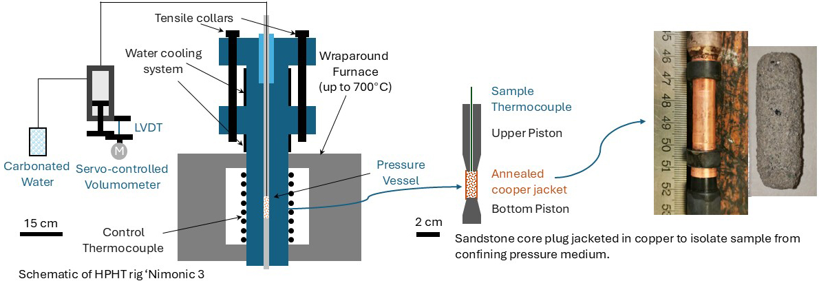 Experiments were conducted using externally heated triaxial deformation apparatus, “Nimonic 2” and “Nimonic 3”. The pressure vessel and sample assembly in these rigs are constructed from nickel alloy (Nimonic®115) which is highly resistance to oxidation and compatible with carbonic acid and other corrosive fluids at elevated temperatures, preventing piston reactions that could contaminate the rock sample (Fig. 3). Samples were contained within annealed copper jackets to isolate them from the water confining fluid, which was pressurised to reservoir conditions using a compressed air pump. Both Pc and Pf were gradually increased in succession up to the required experiment conditions to prevent pore collapse and preserve the starting material grains and microstructure. For control experiments, the pore fluid was tap water (very soft with total hardness of 16 mg L−1, Table S1), while for CO2 proxy experiments, the same water was saturated with CO2 using a SodaStream®. The resulting “fizzy water” contained ∼ 6 g L−1 CO2, yielding a pH of 4. Pf was controlled using a pore volumometer with a piston driven by a DC servo-motor. This system allowed precise adjustments of the piston in and out of a 3 cm3 pressure vessel to maintain a constant Pf through feedback control from a pore pressure transducer. A 50 MPa Pf was used in all experiments to ensure that water remained in a liquid state even above its critical point ∼ 400 °C, thereby preserving consistent stress conditions throughout the experiments. Once at pressure, the experiment temperature was applied using upper and lower external furnaces which create a thermal gradient which can be used to position a “hot spot” within the pressure vessel focused around the relatively small sample. The furnace temperature was increased to the required level using variacs, which control the voltage to the furnaces for precise adjustments. The temperature was then maintained at the set value for 6 d with stable power regulation from the variacs. Sample temperature was monitored using an inconel-sheathed thermocouple inserted down the upper piston. Pre experiment calibrations showed a temperature range of < 2 °C along the sample length at 500 °C. Experiments were ended by decreasing temperature back to ambient conditions then unloading the Pf and Pc in tandem and in reverse to protect the pore space.