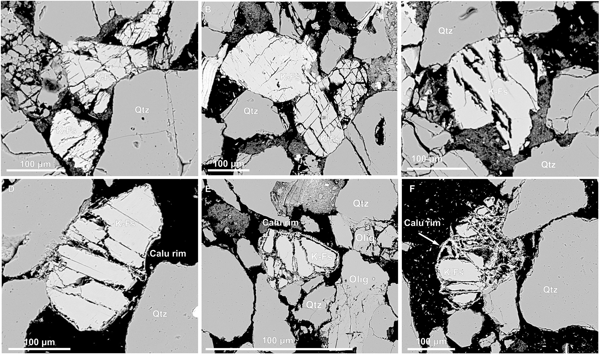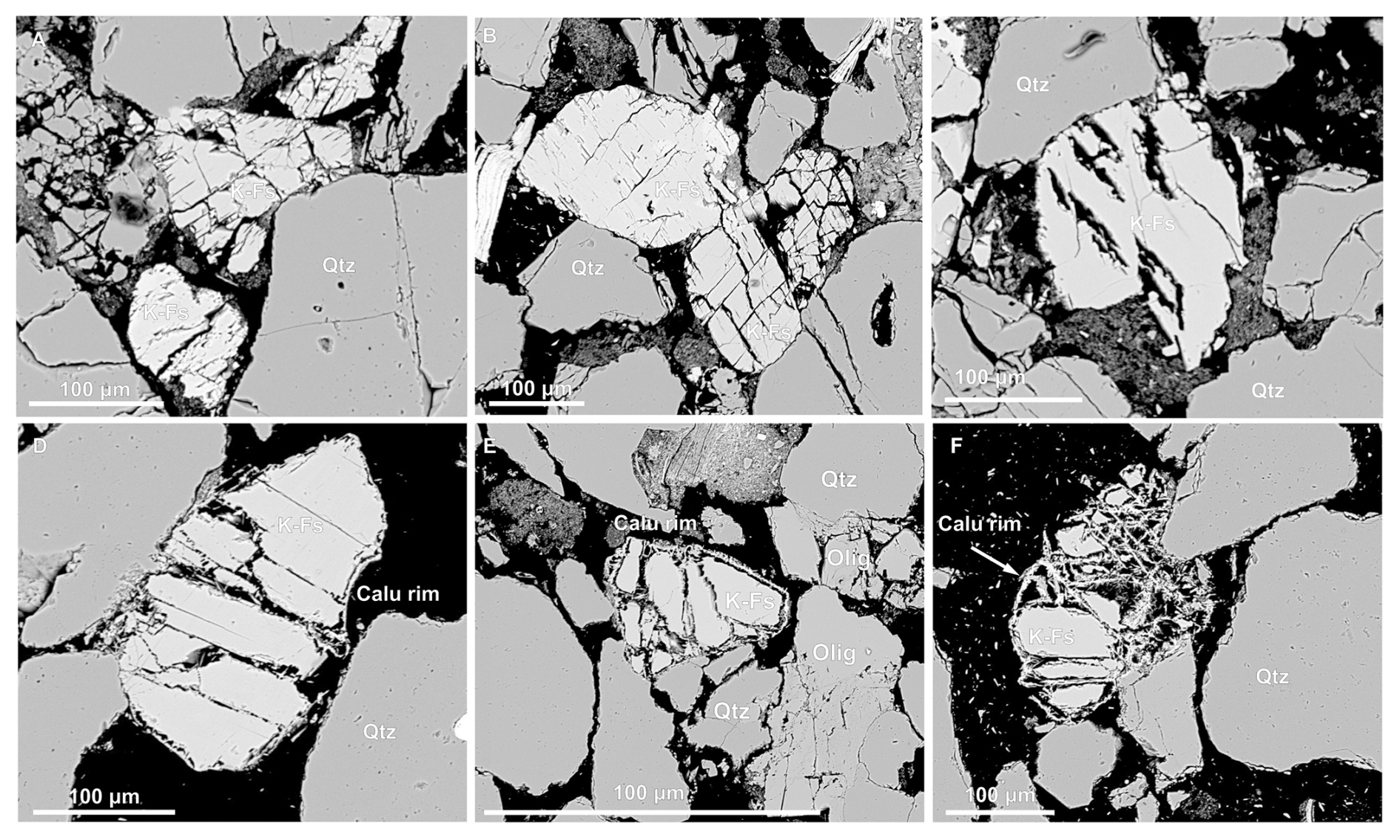 Figure 4Back scattered electron (BSE) images showing progressive K-feldspar (Kfs) alteration via chemical and mechanical deformation with increasing temperature reaction experiments conducted with CO2 fluids at hydrostatic conditions, including – dissolution and grain microfracturing at experiments conducted at 80 °C (A, B), grain dissolution at 250 °C (C), and secondary mineral growth around K-feldspar grains at 550 °C (D–F). Quartz (Qz), (Oligoclase (Olig), K-feldspar (Kfs), Calcic aluminosilicate (Calu).